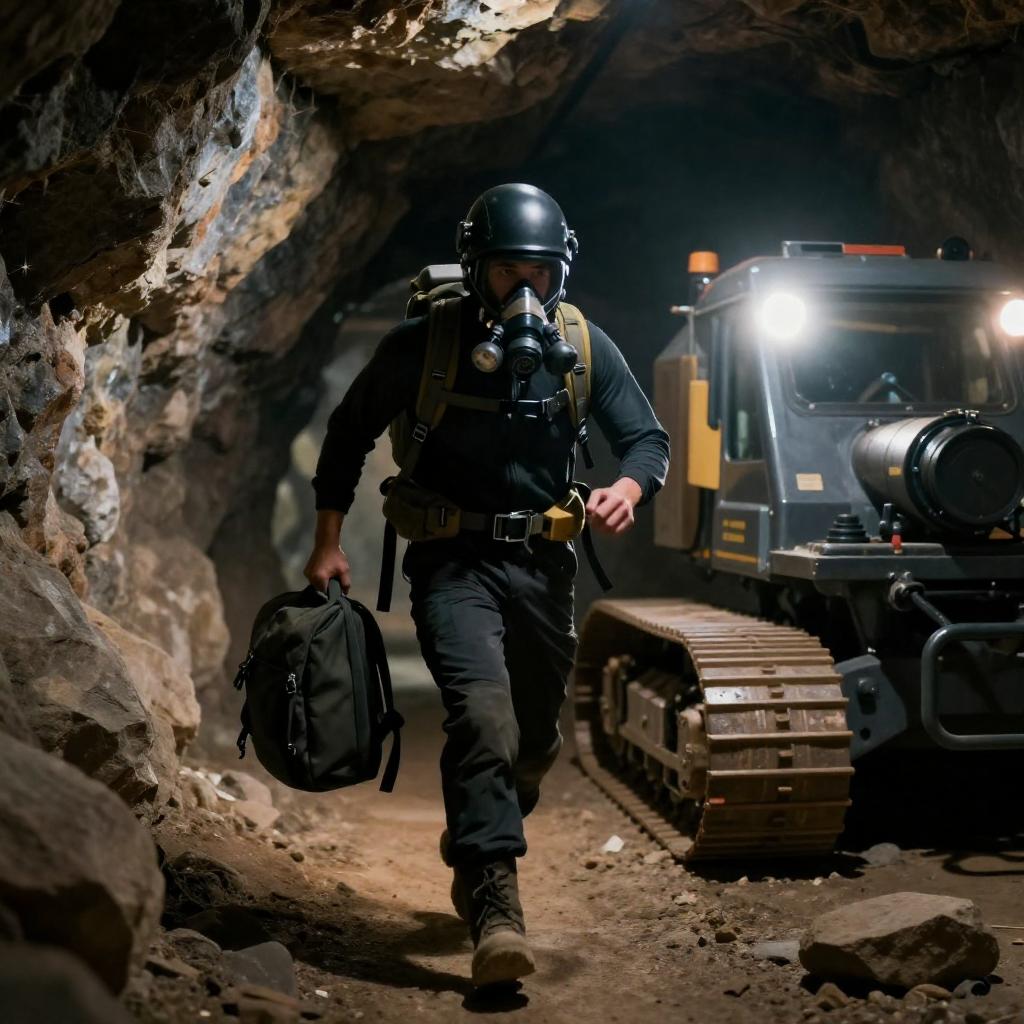 A person in dark, tight-fitting clothing and a helmet with a breathing apparatus runs in a dimly lit, rocky underground tunnel. They carry a backpack in their left hand. Large mining equipment with glowing lights is on the right. The background is a rough, ured rock wall. The person's expression is intense and focused.