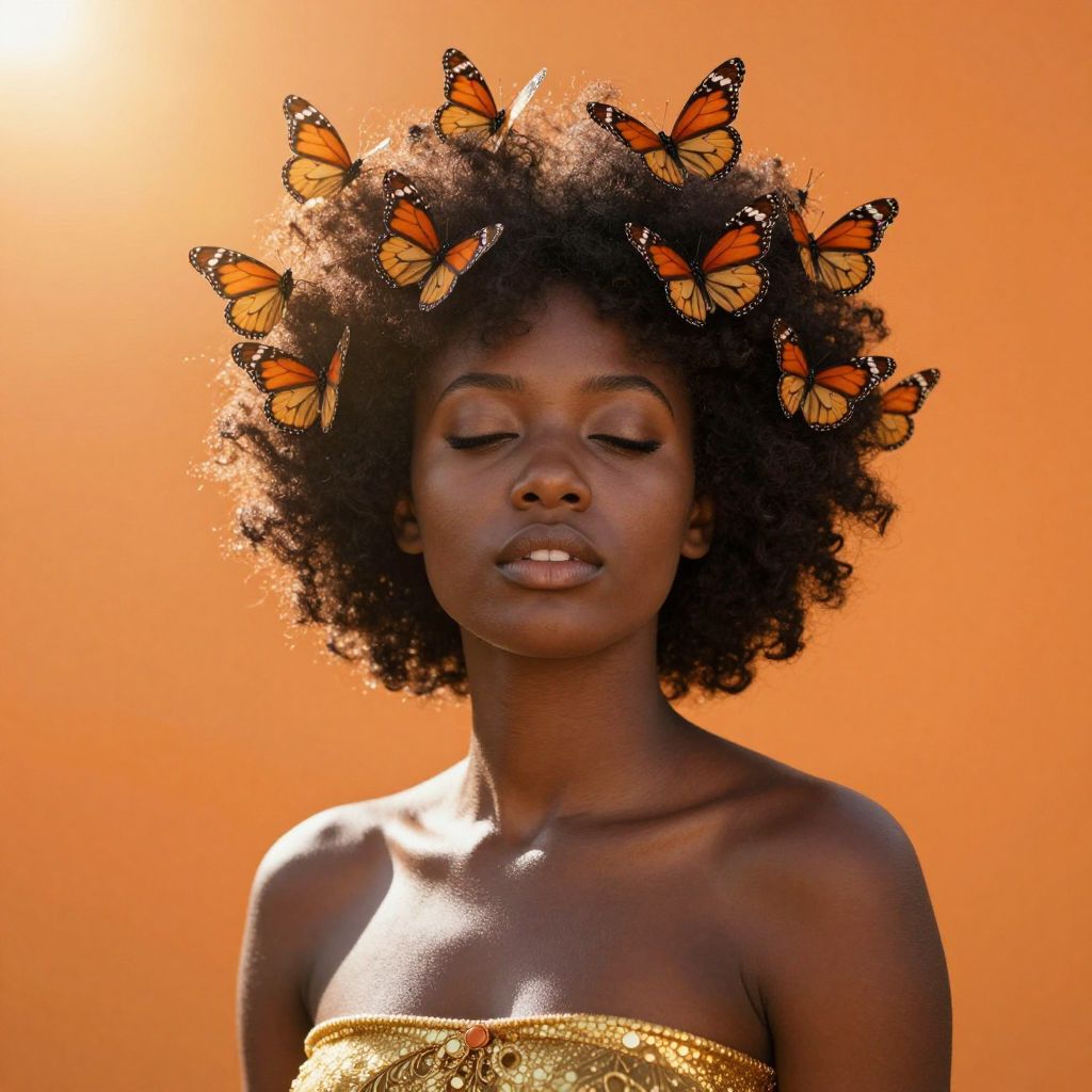 Amidst a vibrant tapestry of orange and gold, a young African woman radiates serenity and strength, her afro crowned by fluttering monarch butterflies—a symbol of transformation and freedom, while the warmth of the sun and the gentle hum of wings evoke a sense of timeless beauty and hope.