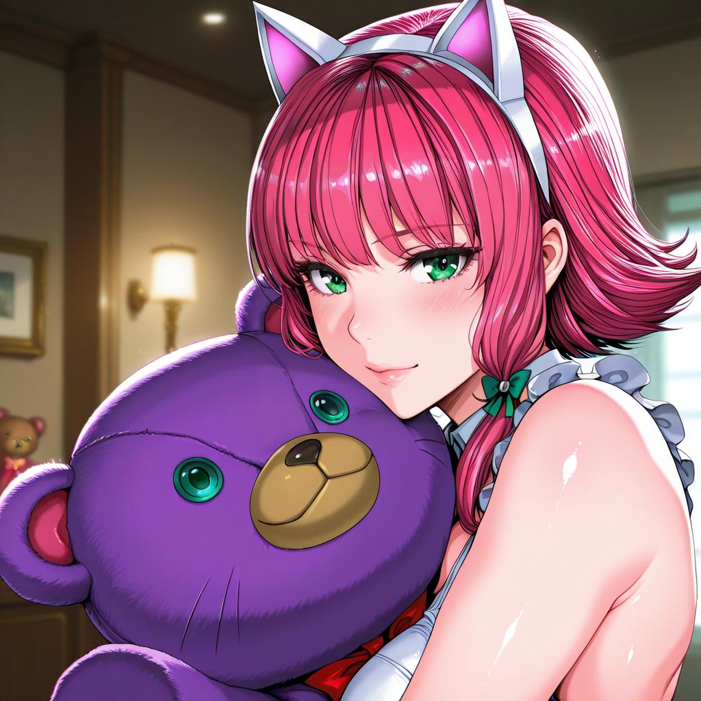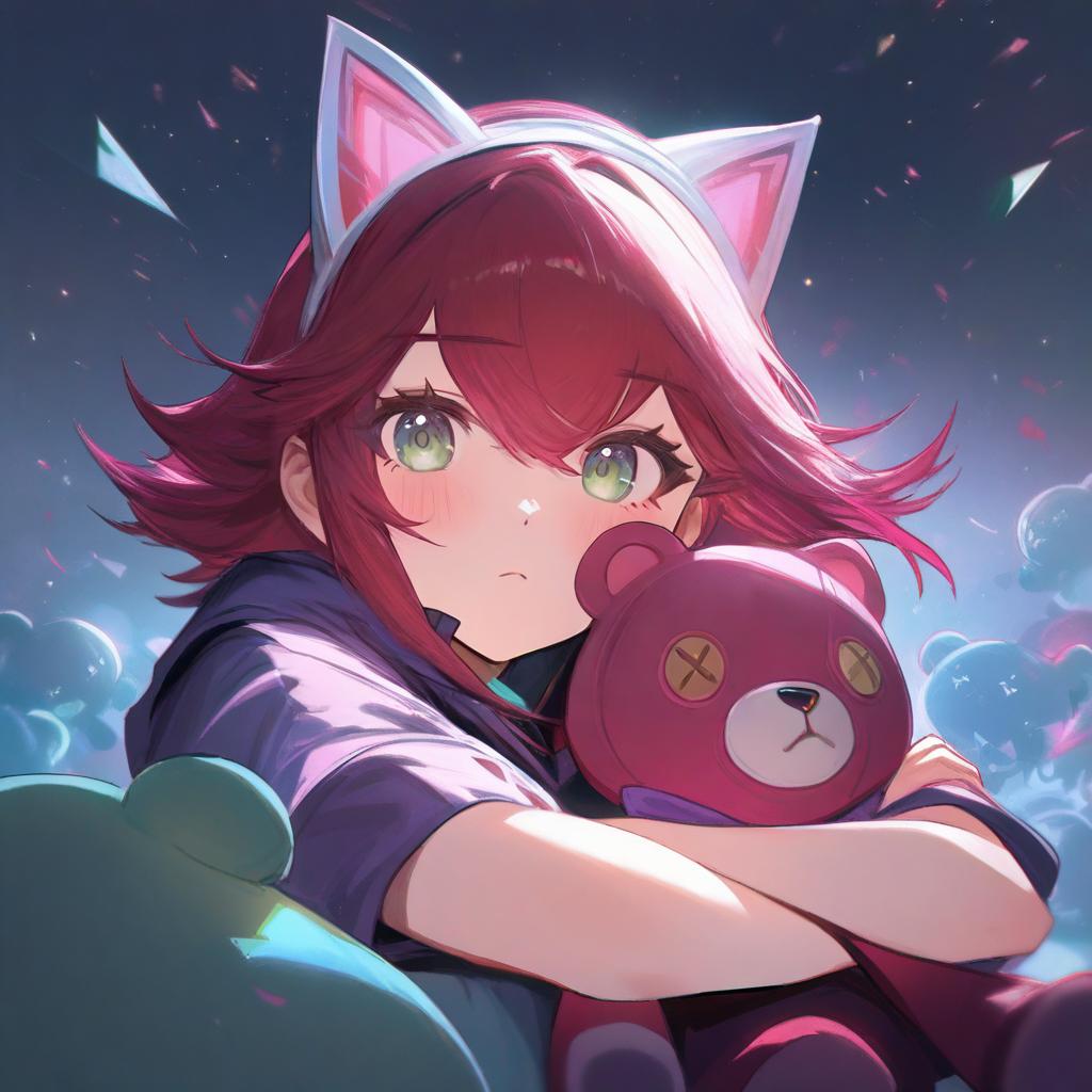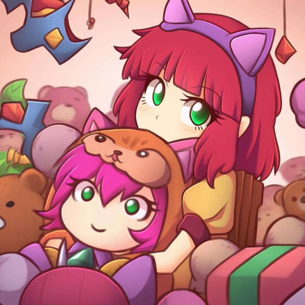 Annie (league of legends), league of legends, 1girl, cat ears, fake animal ears, green eyes, short hair, red hair, pink hair, teddy bear, by artist wool (miwol), anime