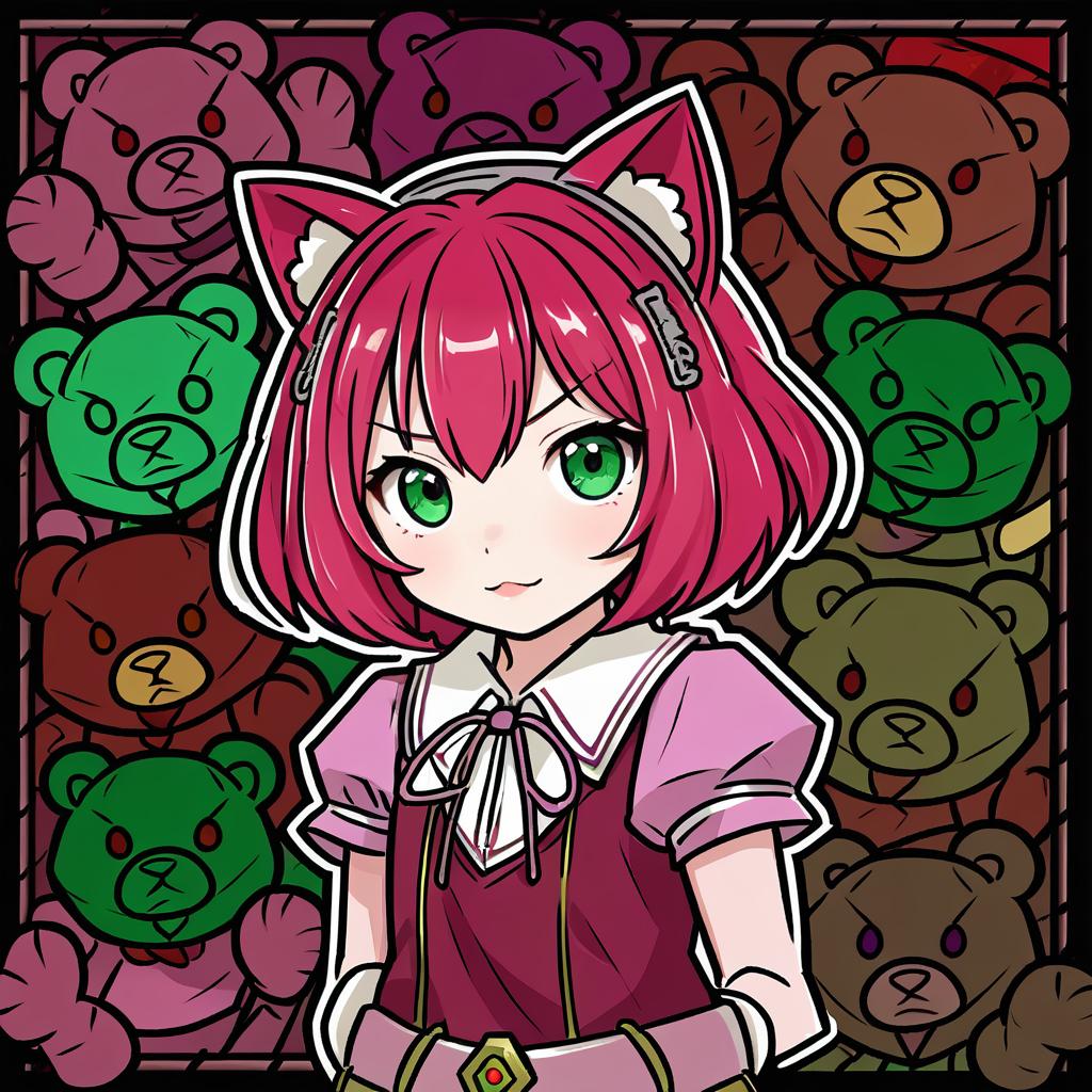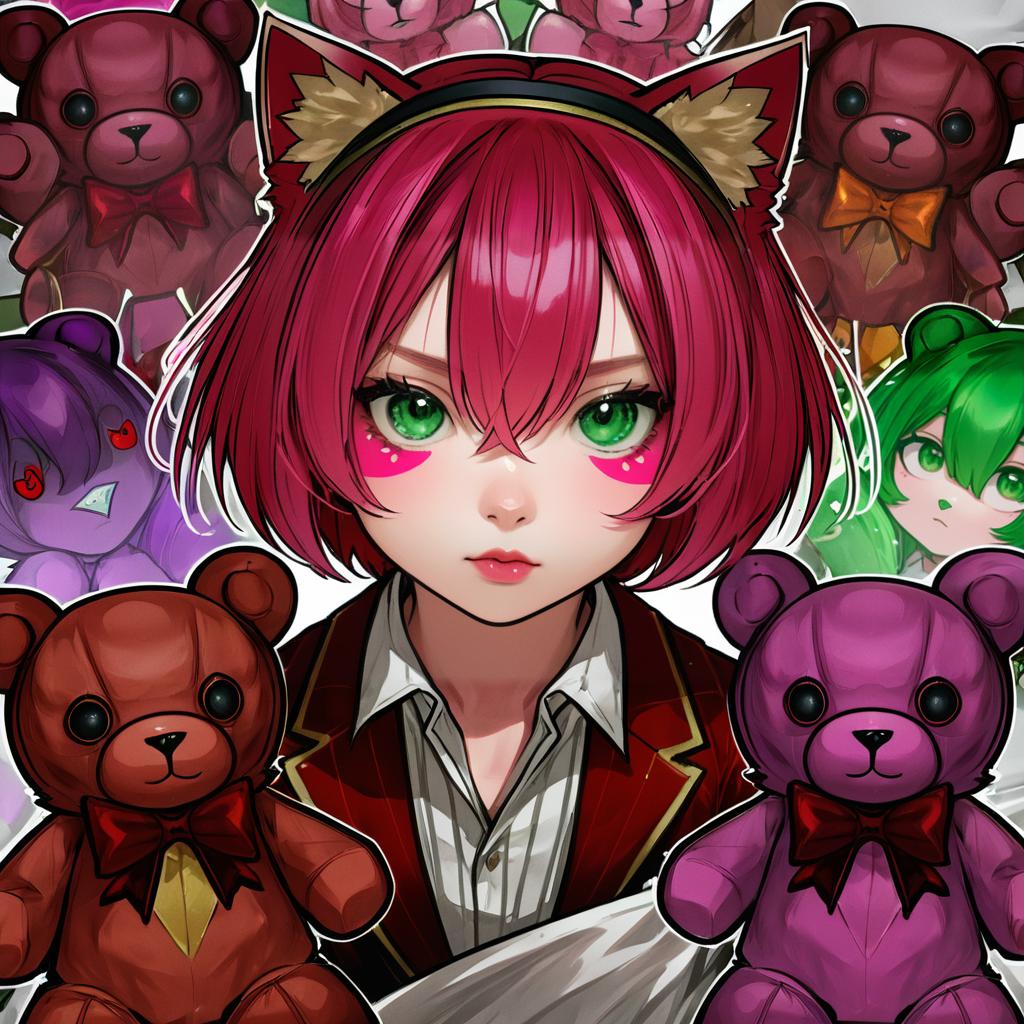 Anime-style illustration of a young girl with short pinkish-red hair, green eyes, and cat ears. She is wearing a dark red outfit with a brown collar, white frills, and a matching tie. The background features multiple colorful teddy bears. The character design is inspired by Annie from League of Legends.
