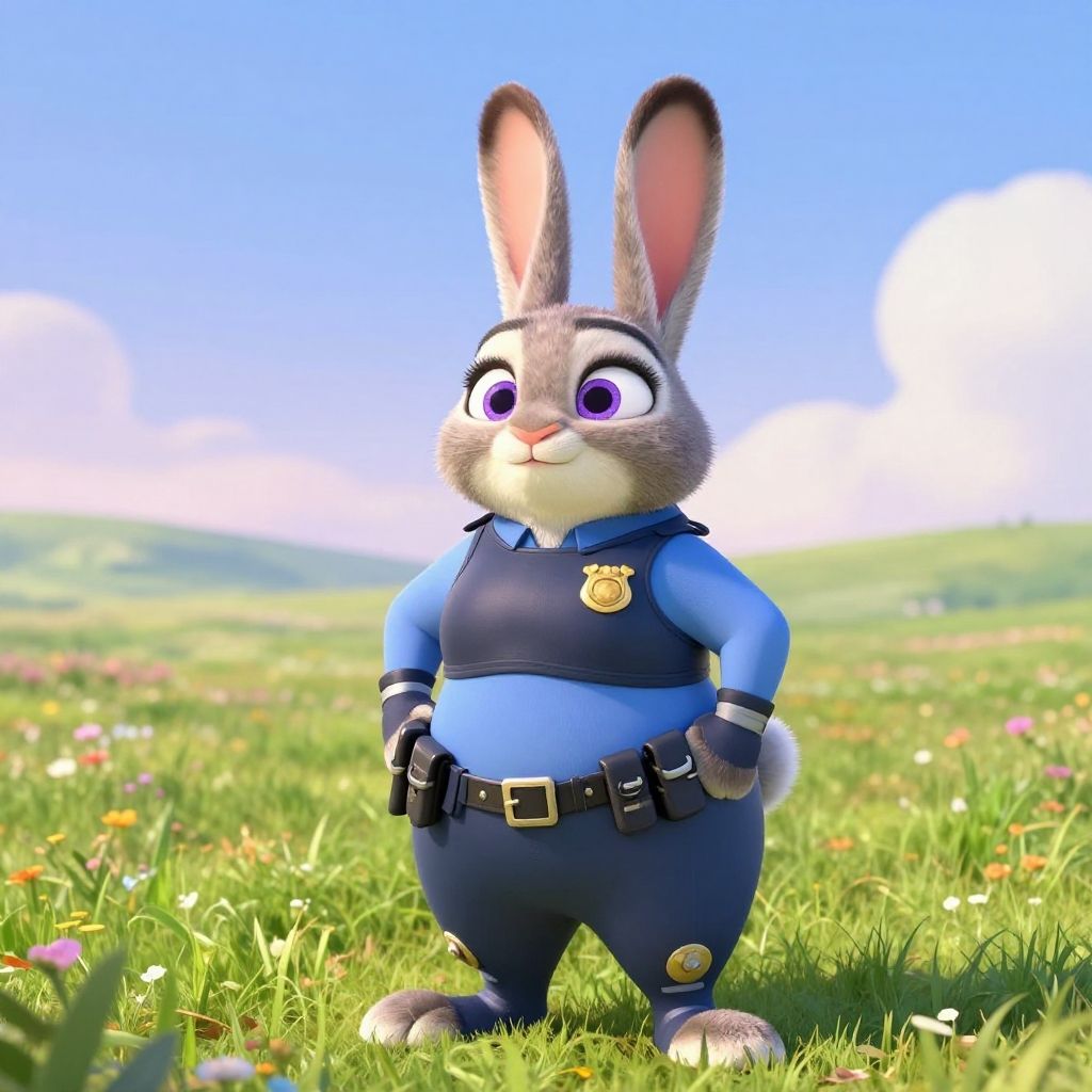 Judy Hopps, (Realistic:1.5), (Digital Render:1.5), (Very Adorable:1.5), (Solo:1.5), (Purple Eyes:1.0), (Police Uniform:1.0), (Obese:1.0), (Huge ass:1.0), (Bunny Tail:1.5), (Gray and white fur:1.0), standing in grassy plains, sunny day.