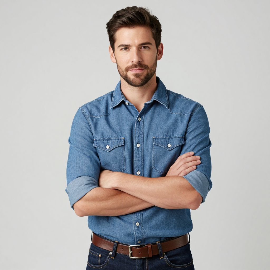 Photograph of a handsome, light-skinned man with short, dark brown hair and a trimmed beard. He's wearing a blue, button-up denim shirt with sleeves rolled up, and dark blue jeans with a brown leather belt. His arms are crossed confidently in front of him. The background is a plain, light gray, putting focus entirely on him. He's looking directly at the camera with a slight smile.