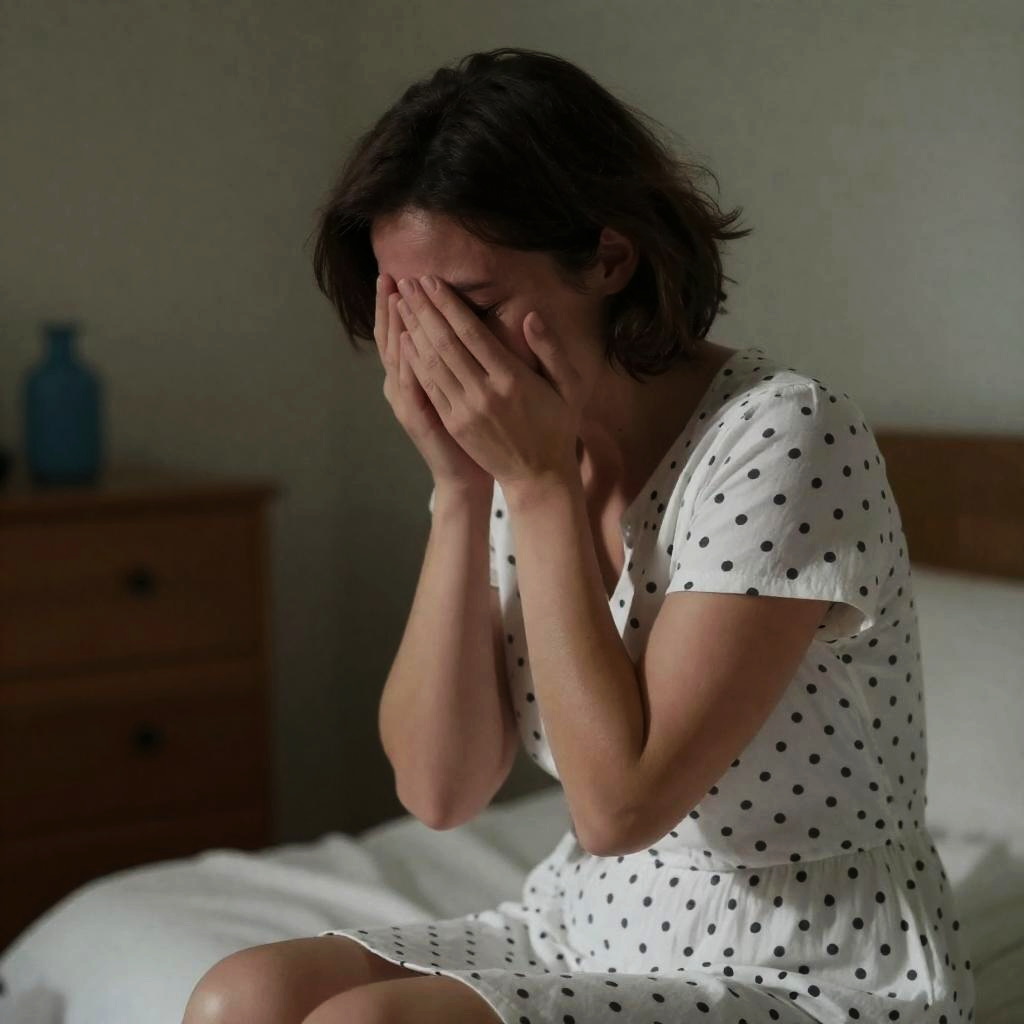 A woman with dirty, blood-stained face and hands sits on a bed, arms raised and tied to a headboard. She wears a black, long-sleeve shirt and has messy, tied-up hair. The bed is covered in plastic, and a lamp is on a bedside table in the background. The room is dimly lit.