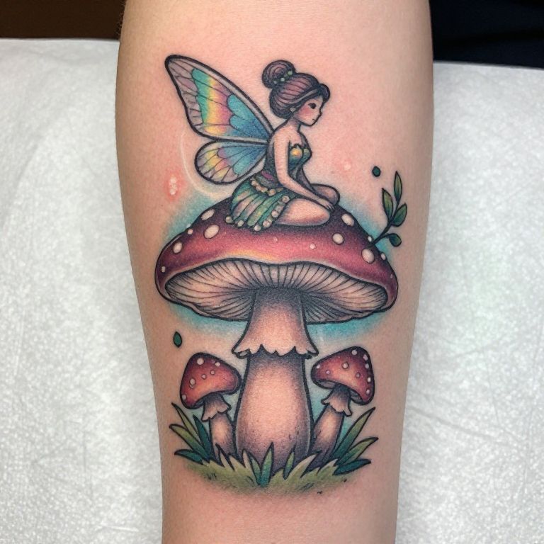 Colorful fairy tattoo with rainbow wings, seated on large red mushroom, surrounded by smaller mushrooms, green leaves, and a soft blue glow.