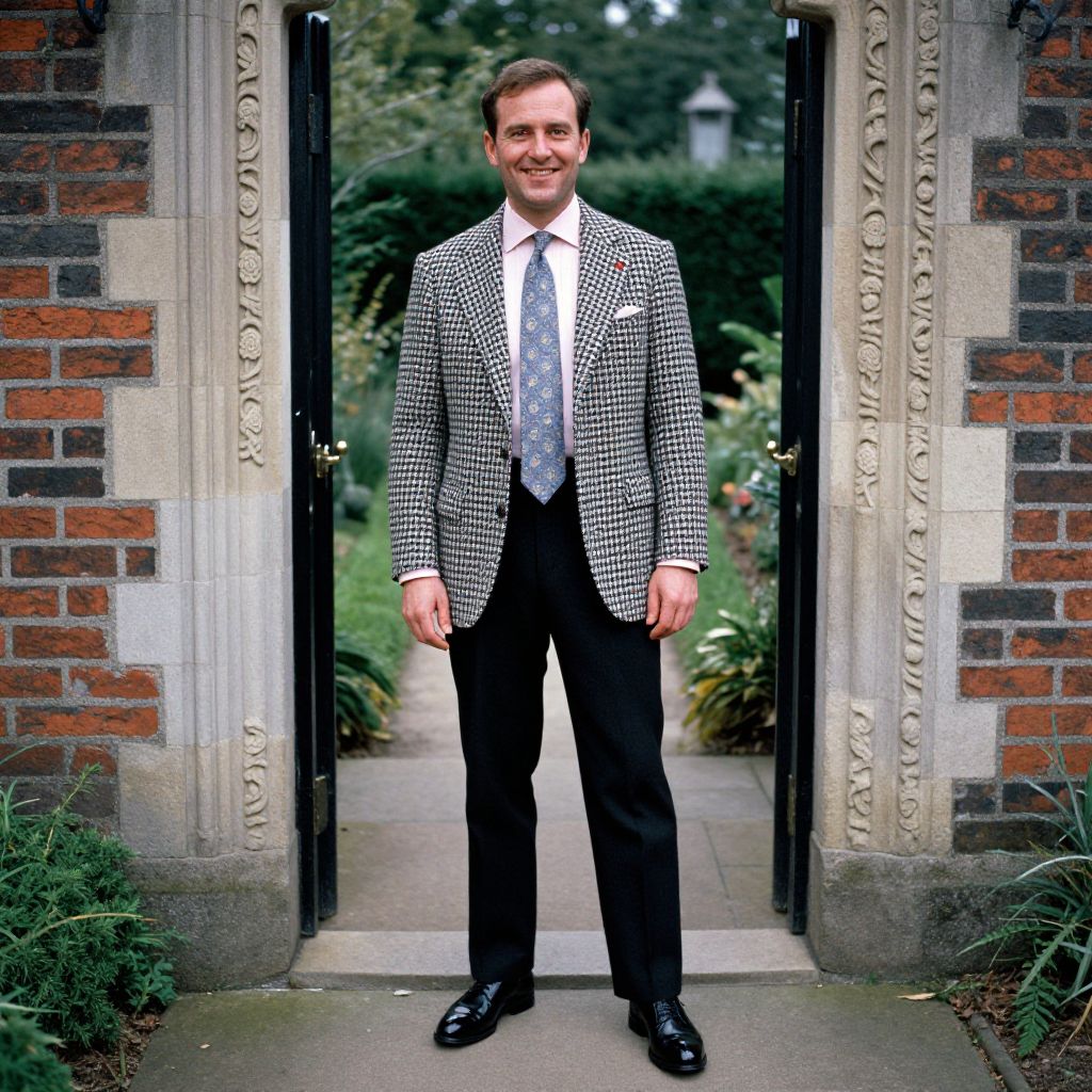 A man, charcoal houndstooth blazer, light pink dress shirt, paisley tie in shades of blue, tailored black dress trousers, glossy black derby shoes, historic brick exterior, intricate stone carvings, lush garden entrance, kodacolor analog film, confident smile. Man has masculine face and piercing eyes