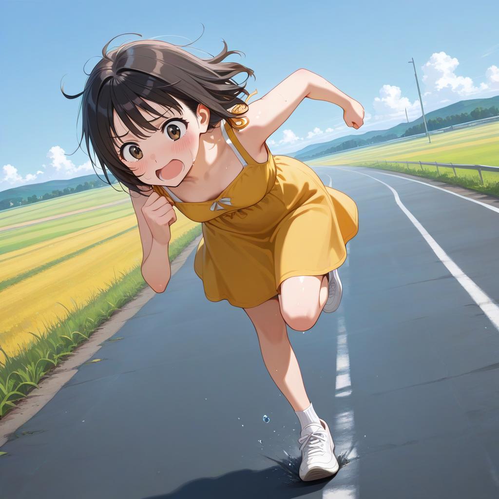Art by kipteitei, 1girl, crying, running down hill, dress, (best quality, masterpiece)