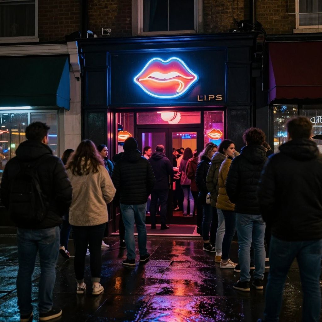 Nighttime photograph of a crowded, neon-lit Lips bar entrance with people in winter clothes, wet pavement reflecting colorful lights.