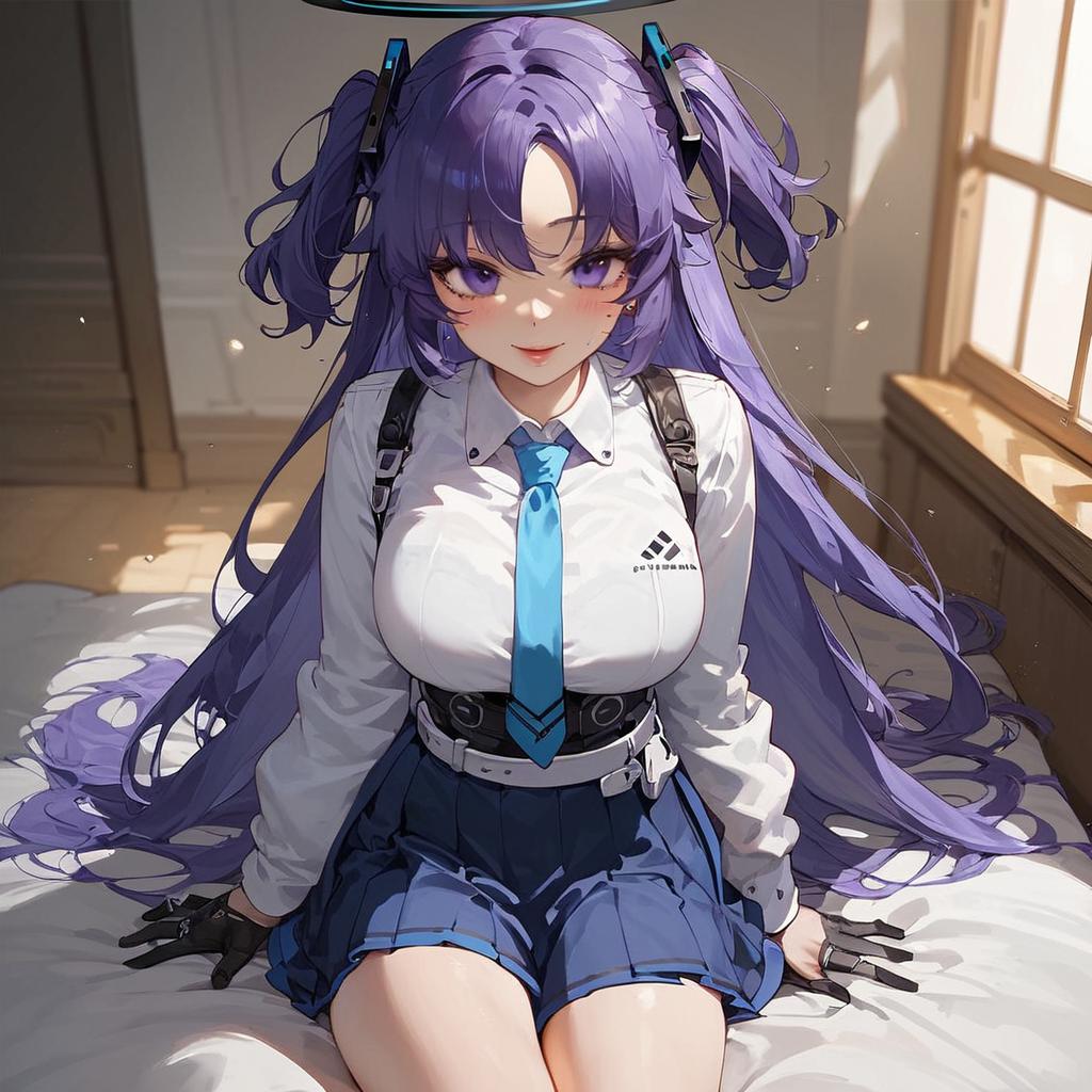 Digital anime-style drawing of a purple-haired girl with long twin-tails, wearing a white shirt with a blue tie, blue pleated skirt, and black suspenders. She has large, expressive purple eyes and a small, cute smile. A black halo floats above her head. She is sitting on a sunlit bed with white sheets, with light streaming through a window to her right. Her large breasts are emphasized by the tight shirt. The background shows a softly lit bedroom with a wooden door and a bed frame. The art style is vibrant and detailed, with a focus on her cute and alluring appearance.