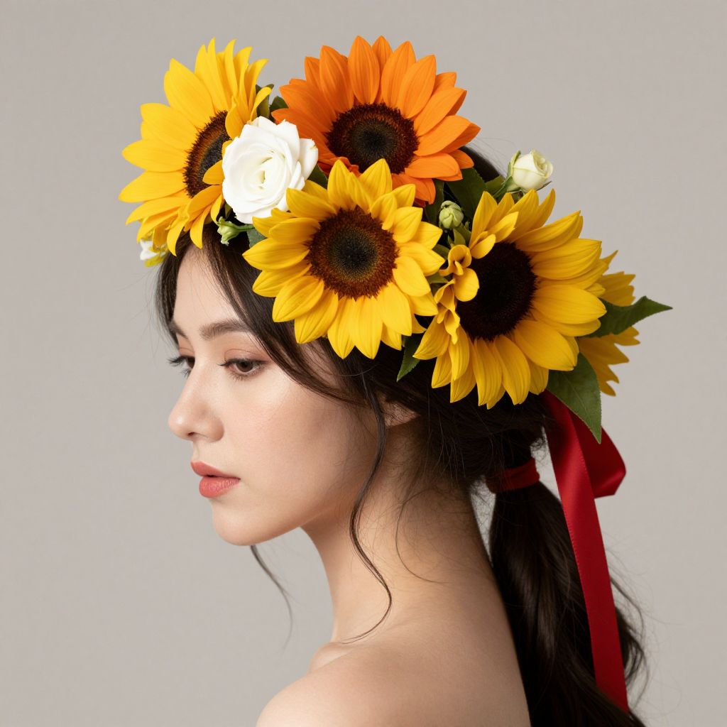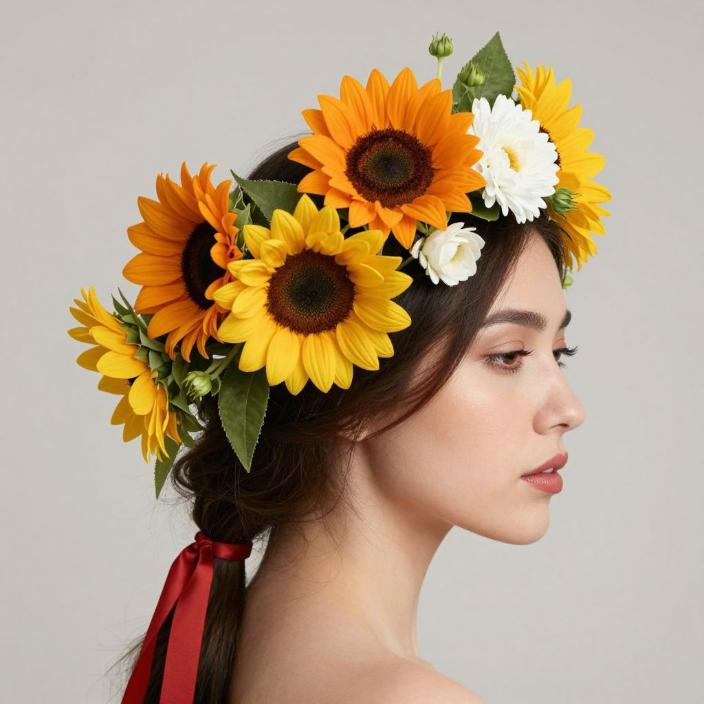 Elegant profile of a woman adorned with a vibrant floral crown featuring six sunflowers—three orange, two yellow, and one white—interspersed with green leaves and buds, complementing her dark hair tied back with a red ribbon against a neutral background.