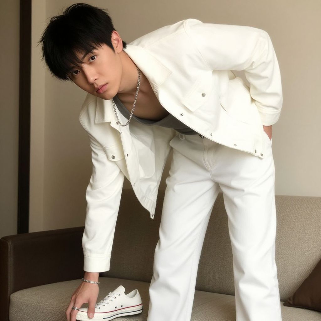Photograph of an Asian male with short, black, slightly messy hair, leaning forward with a serious expression. He wears a white, button-up, long-sleeve shirt over a black undershirt, paired with white jeans and white high-top Converse sneakers. A silver chain necklace rests around his neck. He stands in a modern, minimalistic living room with a beige sofa in the background. His right hand is on his knee, while his left hand is on the sofa, slightly bending forward. The lighting is bright, highlighting his white outfit against the neutral-toned background.