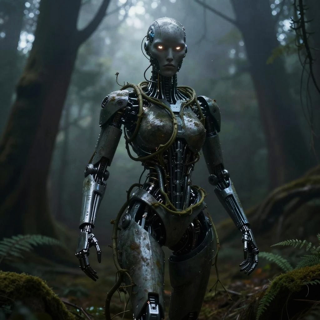 Sigma creeper lurking in a dark forest, glowing eyes piercing through fog, futuristic yet primal appearance, cybernetic vines wrapping around a humanoid form, moody lighting