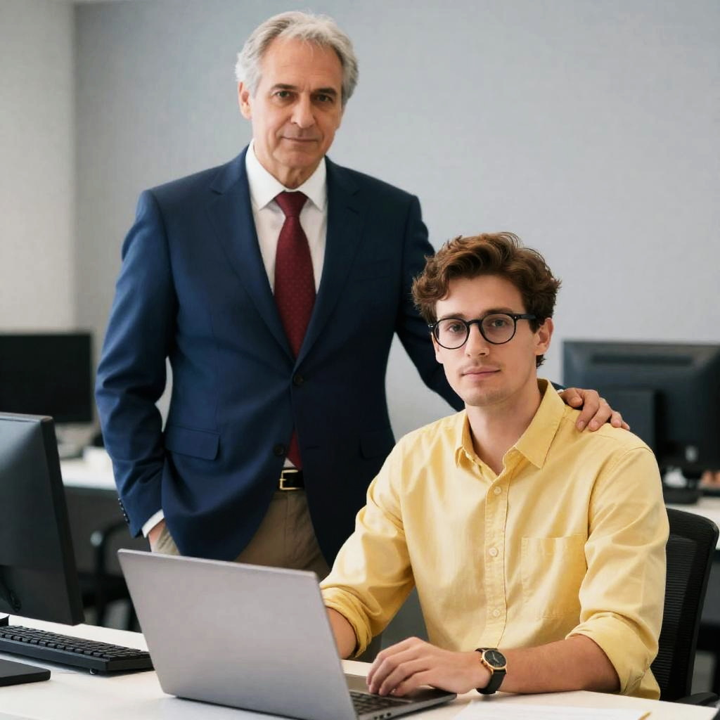 Two men with short brown hair, one in a black shirt and jeans, the other in a blue jacket with red accents, lean over a wooden table displaying a detailed model of a white building with green trees. The background features a lit, paneled wall and exercise balls. The men appear engaged in a discussion about the model.