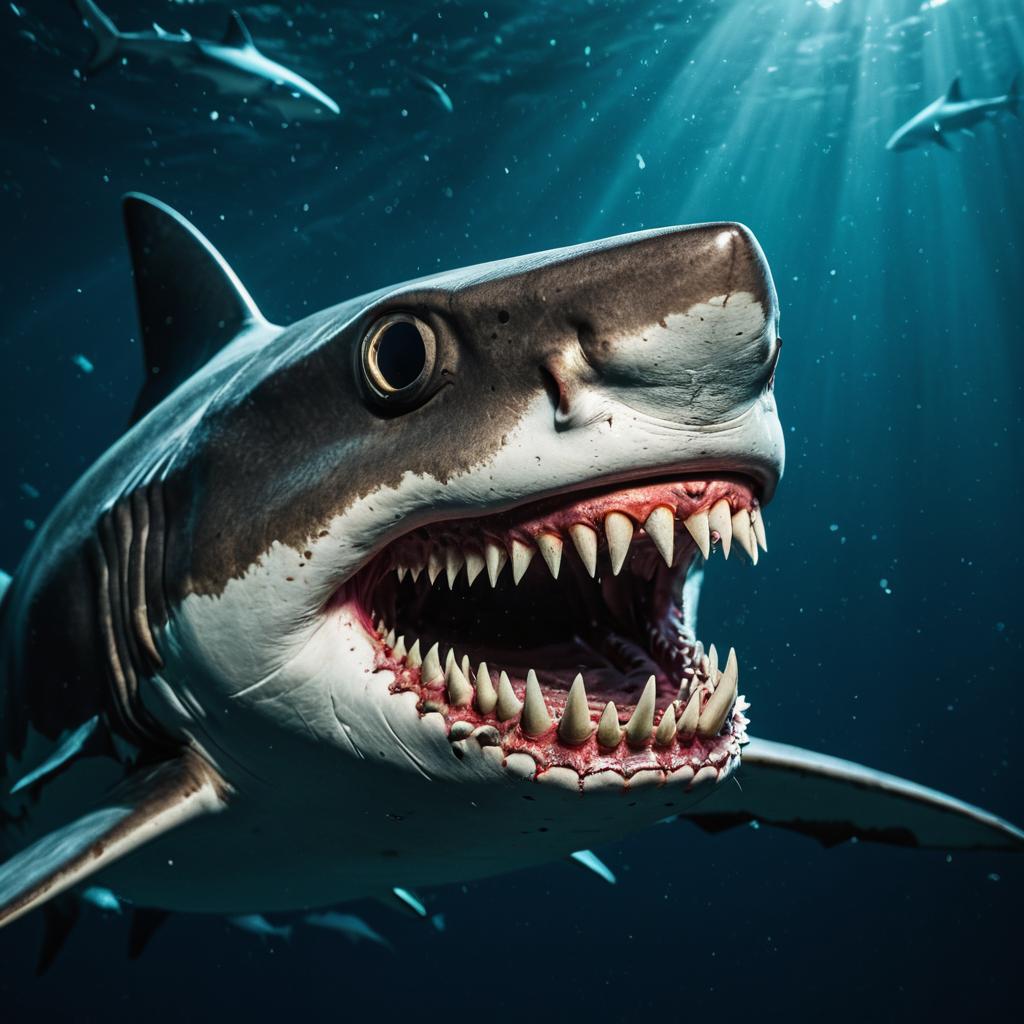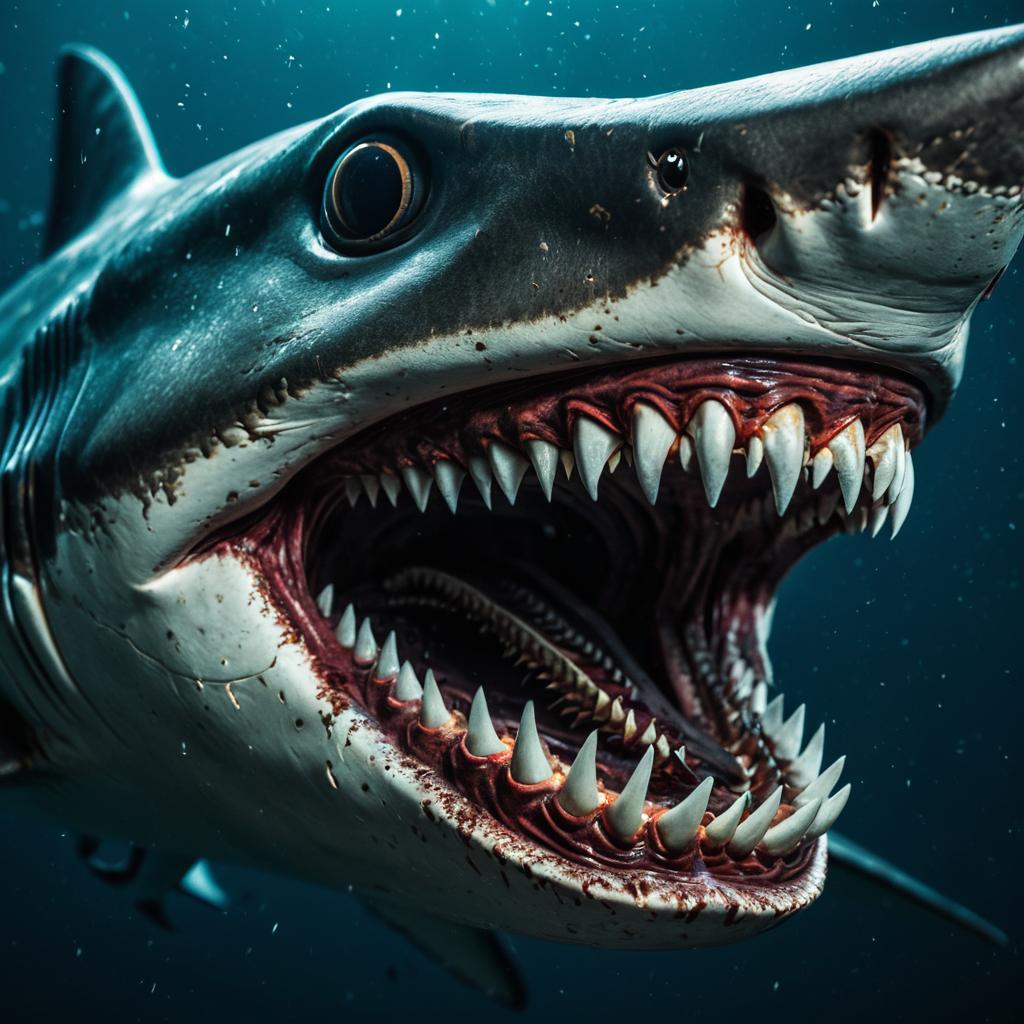 High-resolution close-up of a lovecraftian-inspired horror shark underwater with its mouth wide open, revealing 29 rows of sharp, detailed teeth. The shark shows intricate textures and color grading, creating a cinematic and eerie atmosphere, captured with ultra-wide angle and depth of field effects.