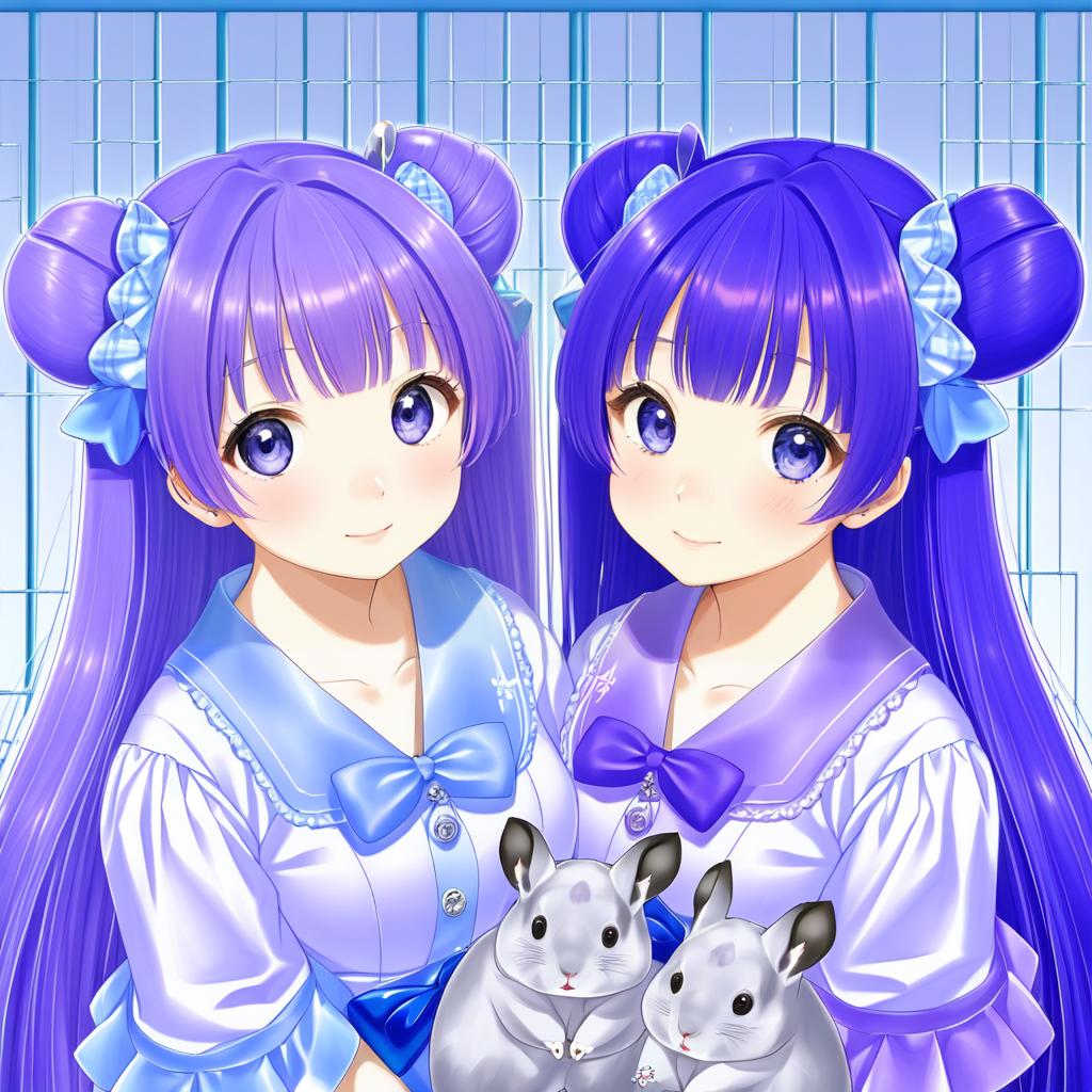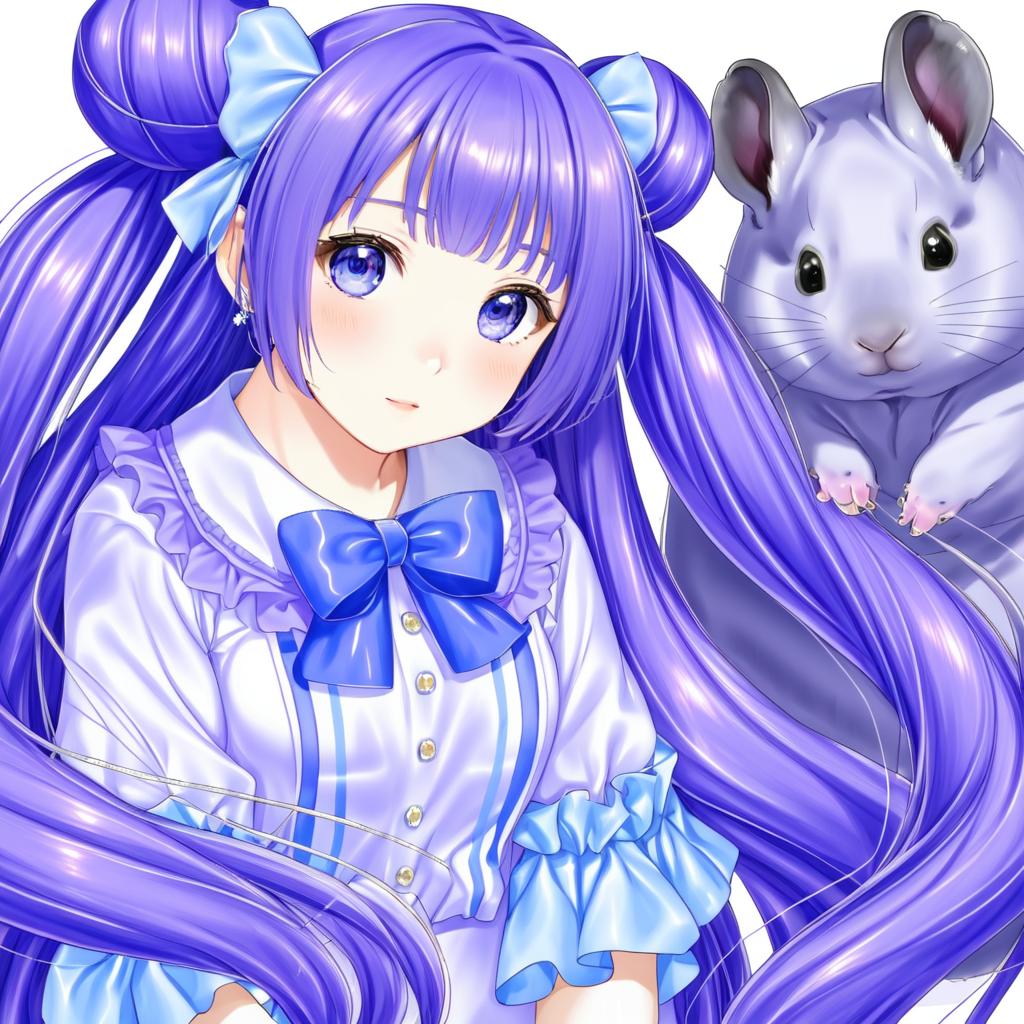 Amamiya shizuku (hizuki yayoi), original, 1girl, hair between eyes, blue eyes, purple eyes, purple hair, very long hair, blue hair, two side up, double bun, hair bow, medium breasts, collarbone, white shirt, blue bow, chinchilla (animal), animal, by artist torimaru, anime