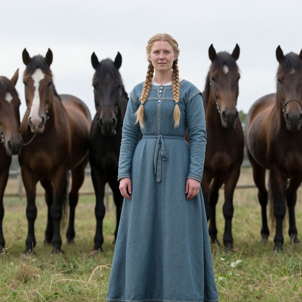Historical viking dress, woman in a blue dress with braids standing in front of a group of horses