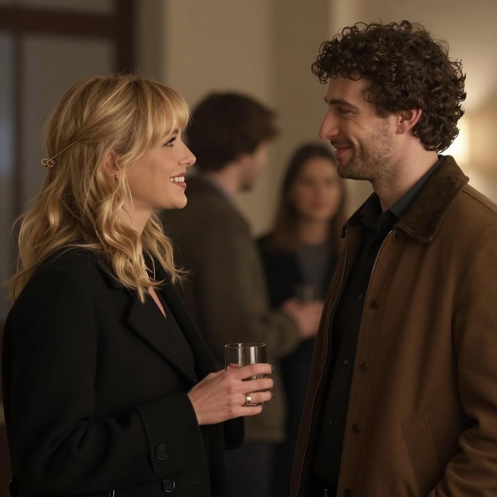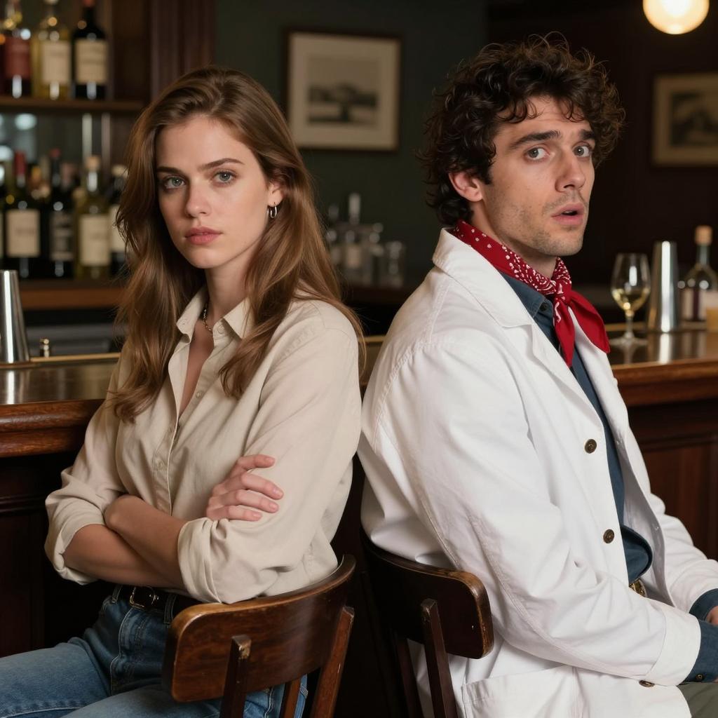 Two people with intense expressions. Woman with platinum blonde hair, bangs, brown fur coat, eating a large, raw meat chunk. Man with dark curly hair, beard, black shiny jacket, biting into meat with visible teeth. Wicker basket in foreground. Warm, golden, ured background. Both seated close together.