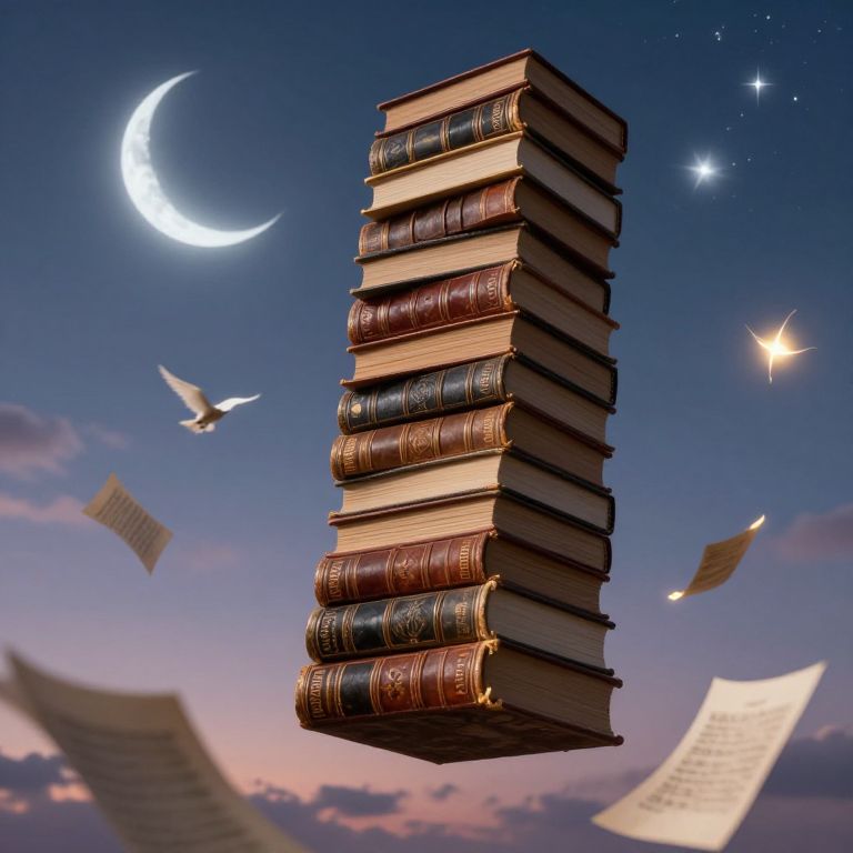 A towering stack of ancient, leather-bound books defies gravity as it floats serenely in a twilight sky, surrounded by drifting pages and ethereal birds, beneath a celestial backdrop of a crescent moon and a luminous planet.