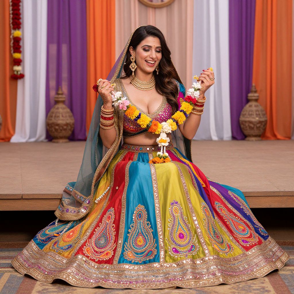 Photograph of a smiling South Asian woman with medium brown skin and long dark hair, wearing a vibrant, multi-colored traditional lehenga choli adorned with gold embroidery and floral patterns. She holds marigold garlands in her hands, and wears a matching dupatta, gold jewelry, and bangles. The background features a stage with draped orange, purple, and white fabric, and two ornate clay pots. The woman's attire is richly textured, and she sits on a wooden platform, exuding joy and cultural pride. The image is brightly lit, emphasizing the vivid colors and intricate details of her attire.