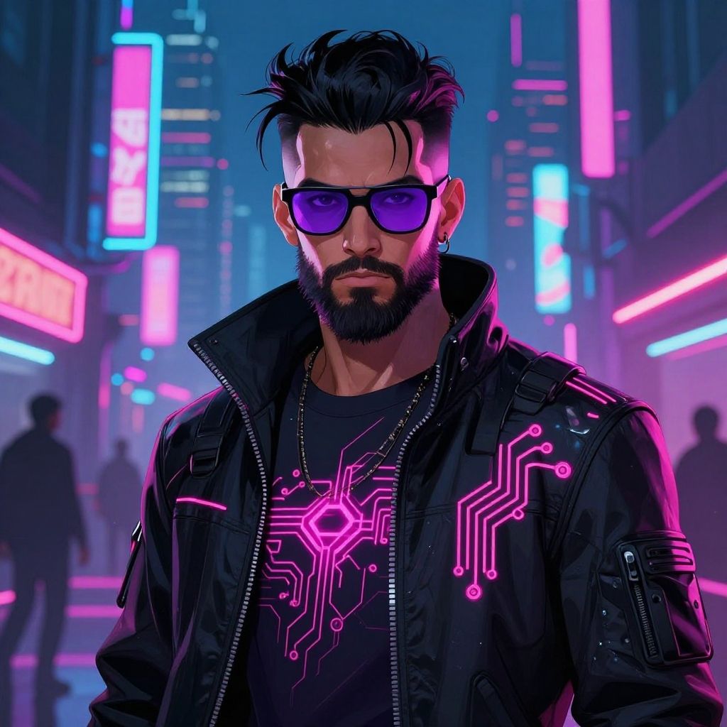 Digital painting of a cyberpunk hacker standing in a neon-lit futuristic cityscape. The male subject has intense facial features with a well-groomed beard, a high fade hairstyle with long top strands, and wears purple-tinted glasses. He is dressed in a high-collared, black futuristic jacket with neon pink circuit-like patterns and a dark t-shirt featuring a glowing design. The background includes vibrant neon signs and silhouettes of people, emphasizing a high-tech, dystopian urban environment.