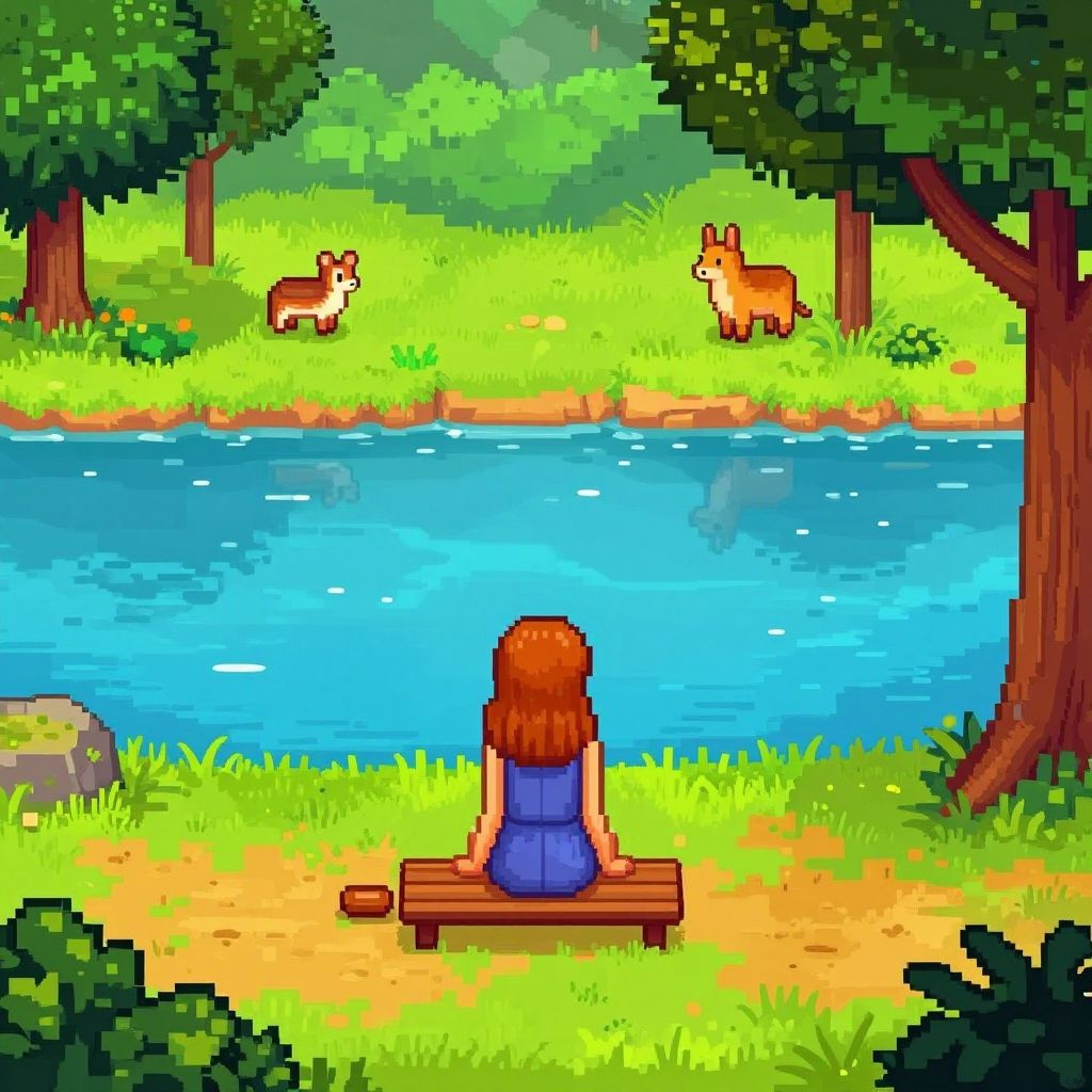 Caroline Stardew enjoying a calm afternoon by a sparkling lake, surrounded by nature and wildlife, pixel art style with bright colors and peaceful mood