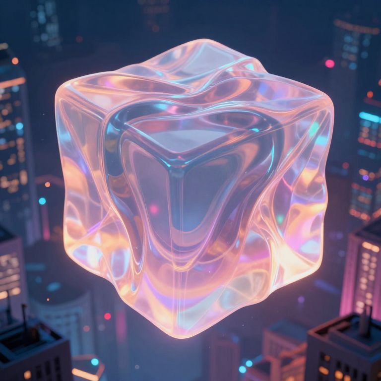 Glowing, transparent, crystal-like cube floating above a neon-lit, futuristic cityscape with colorful, blurred skyscrapers in the background.