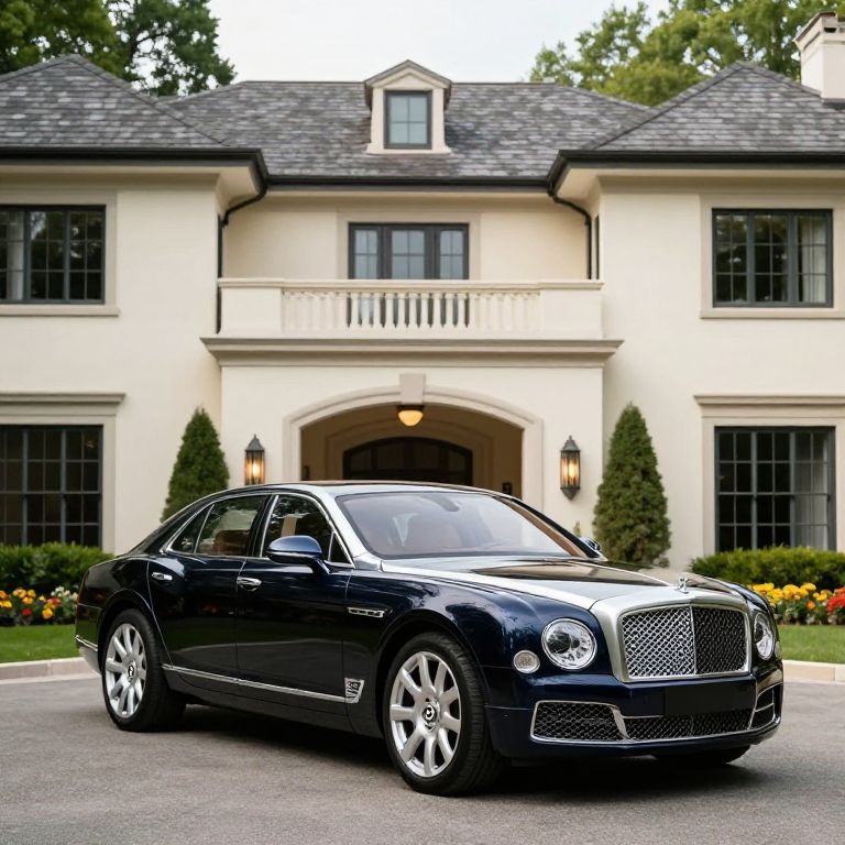 Luxurious 2019 Bentley Mulsanne Speed parked gracefully in front of a grand, cream-colored mansion with arched entryway and lush green landscaping in Greenwich, CT.