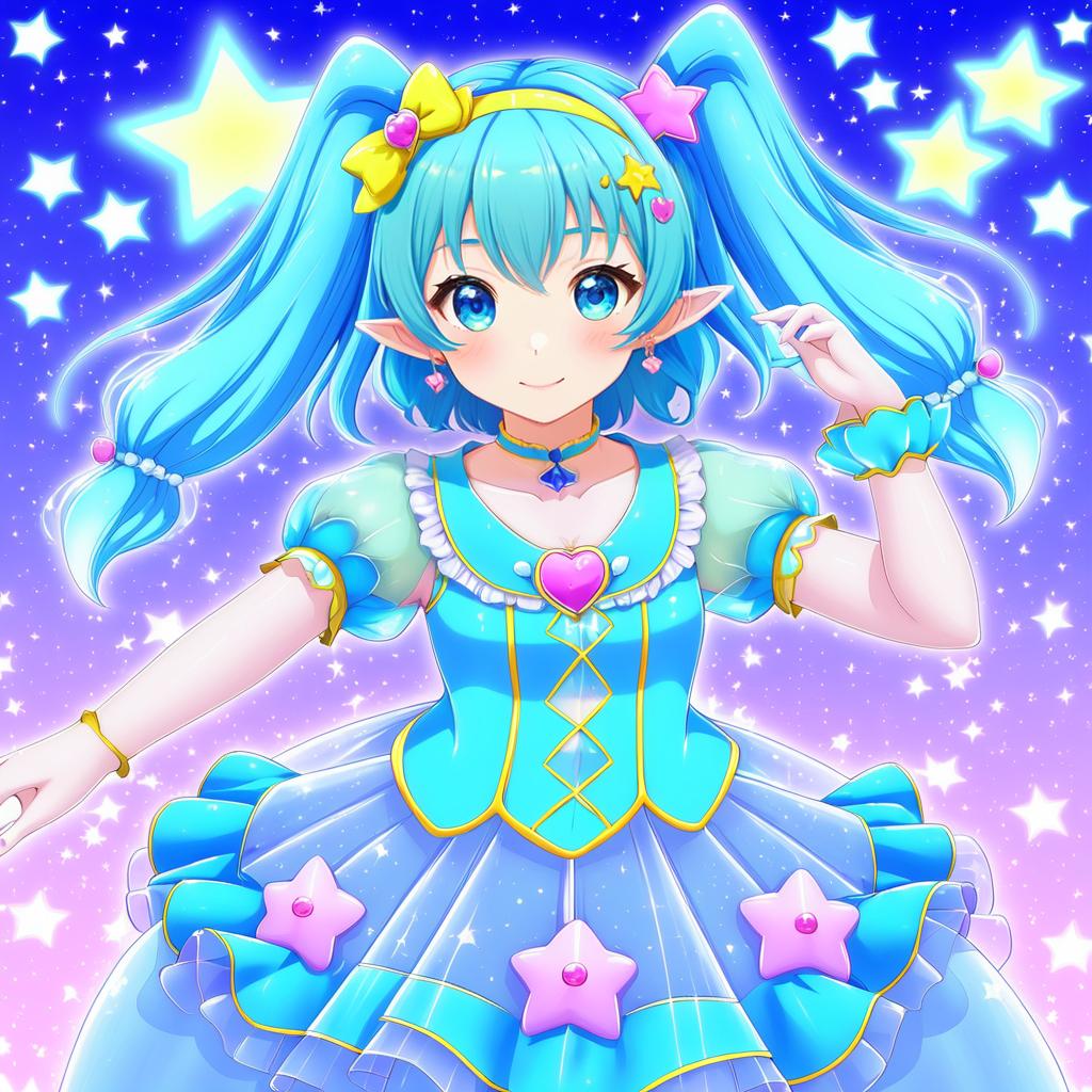 Cure milky, precure, 1girl, pointy ears, aqua eyes, blue eyes, hair between eyes, star-shaped pupils, star in eye, aqua hair, long hair, blue hair, medium hair, short hair, star hair ornament, yellow hairband, collarbone, see-through sleeves, choker, aqua choker, puffy short sleeves, star earrings, magical girl, magical girl, wrist cuffs, by artist sheita, anime