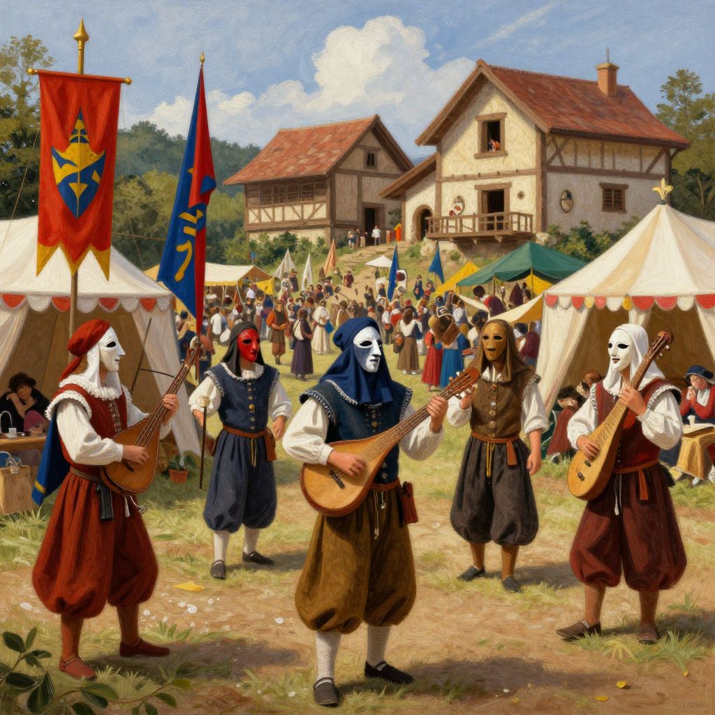 A vibrant renaissance festival scene featuring performers wearing traditional period costumes and masks, playing musical instruments such as lutes and mandolins. Colorful banners and tents surround a lively crowd gathered in a rustic medieval village setting with half-timbered houses under a partly cloudy sky. The image is depicted in a rich, painterly style with dramatic lighting, capturing the festive ambiance of the era.