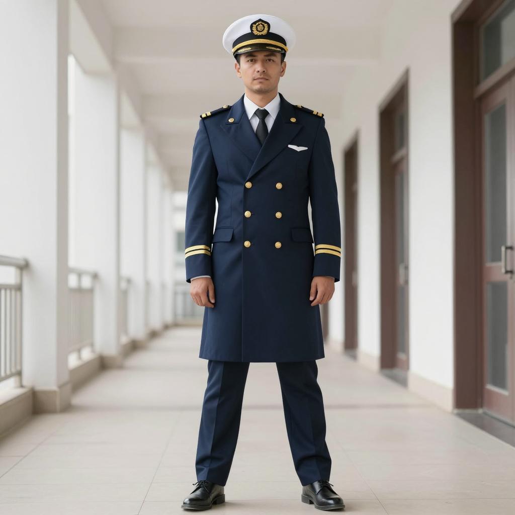 A black train with three uniformed conductors in dark suits and caps standing near the open door. One conductor is assisting a bald man in a beige suit stepping out of the train. The train's dark exterior contrasts with the light-colored conductor's uniform. All conductors have serious expressions. Four visible train wheels and a metallic train window frame are in the background.