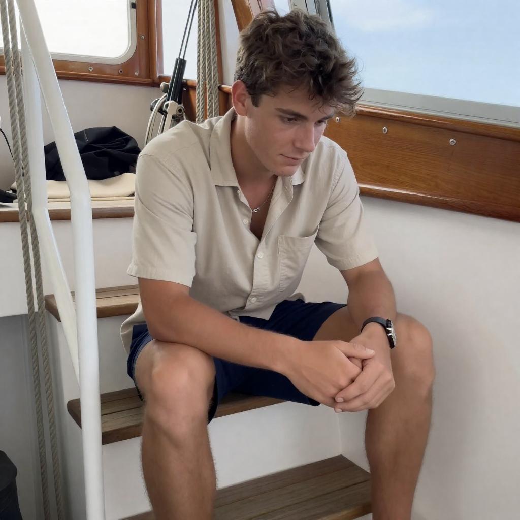 Young man with short brown hair, wearing beige shirt and blue shorts, sitting on wooden stairs inside cluttered boat. Hands clasped, looking down. White railing and various ropes in background. Natural light from window. Casual, relaxed posture. Boat interior with wooden ures and nautical equipment.