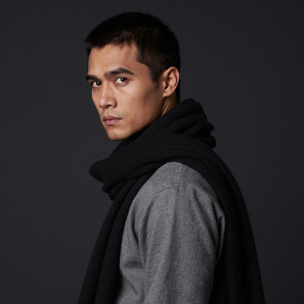 A man with short dark hair, light skin, and intense gaze, looking over his shoulder. He wears a gray tunic and a ured black scarf draped over his shoulders. Dark background. Upper body shot, slight profile.