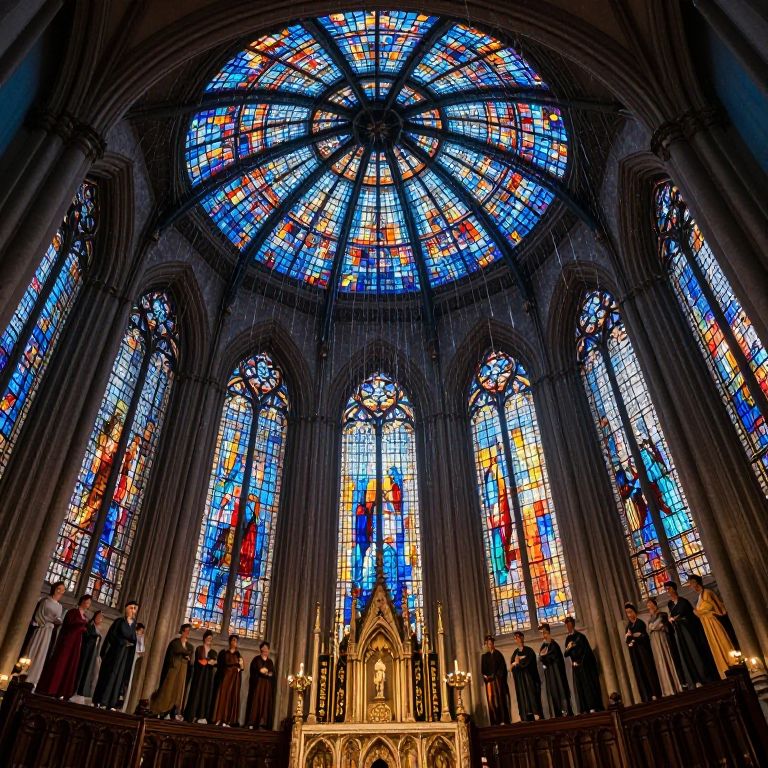 Photograph of a grand cathedral interior showcasing vibrant, intricate stained-glass windows in blue, red, and yellow, with statues of saints lining the lower