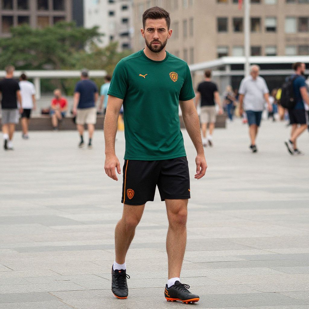 A man, short-sleeve athletic tee, deep green with orange logo, flexible soccer shorts, black with orange piping, durable soccer boots, matte black with orange soles, bustling city square, lithographic film style, focused expression, vibrant energy. Man has masculine face and piercing eyes
