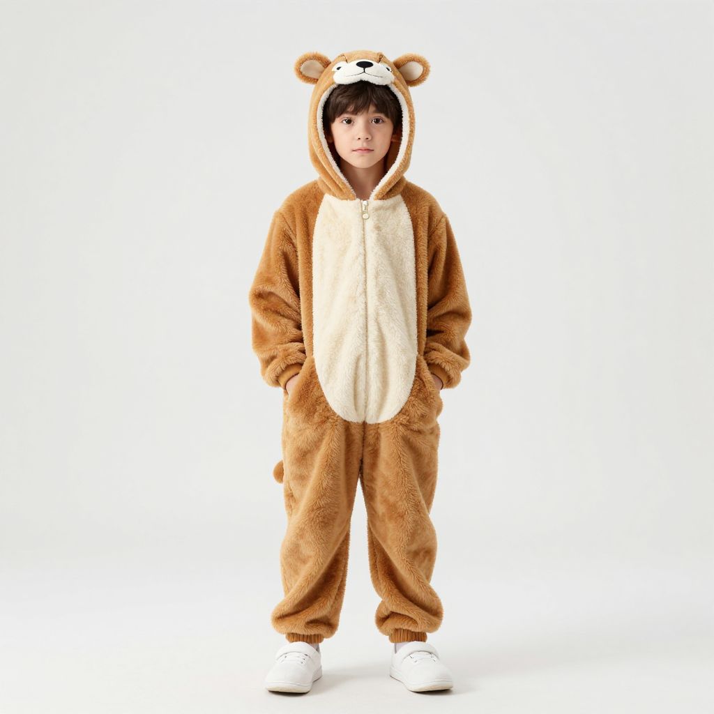 Photograph of a young boy standing against a plain white background. He is wearing a full-body, brown and cream-colored bear costume with a furry texture. The costume has bear ears on the hood, a cream-colored front panel, and white sneakers. The boy has short black hair and is looking directly at the camera with a neutral expression. His hands are in the costume's pockets. The image is brightly lit, emphasizing the soft texture of the costume.
