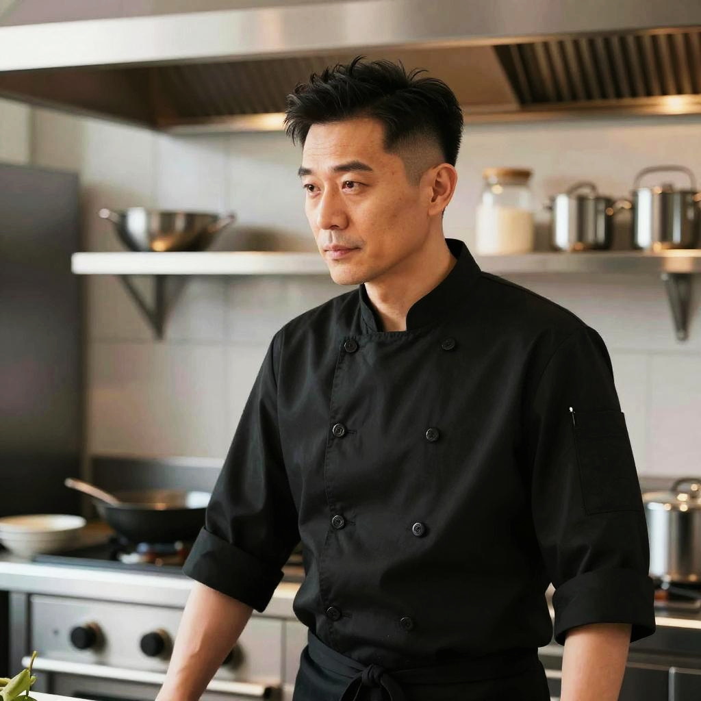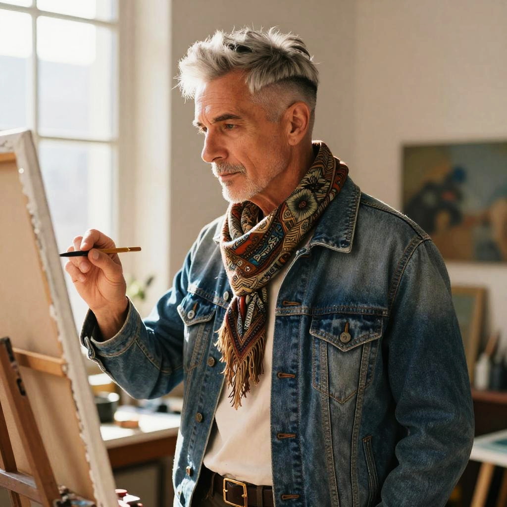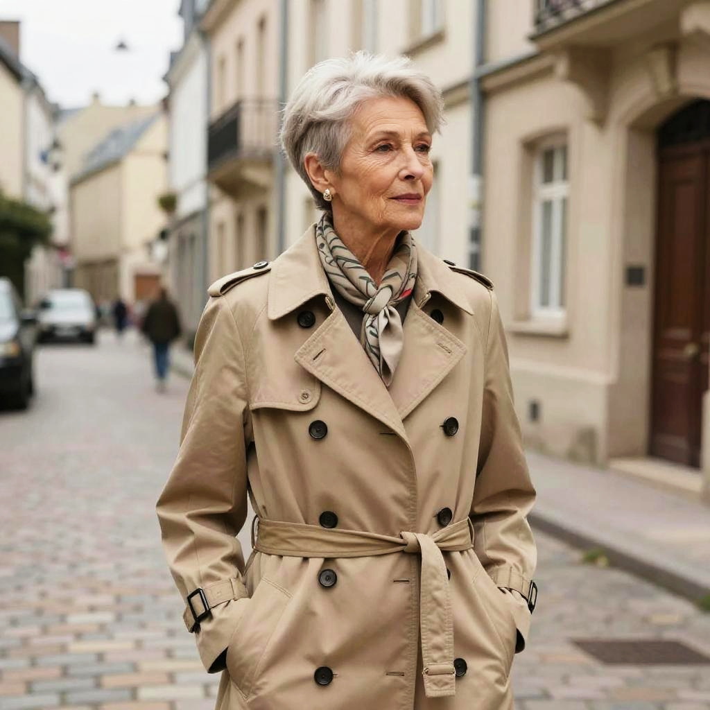 Skin Fade hairstyle on elderly woman, wearing classic wool trench coat and scarf, in quaint European street, captured in fashion editorial style with overcast diffused daylight.