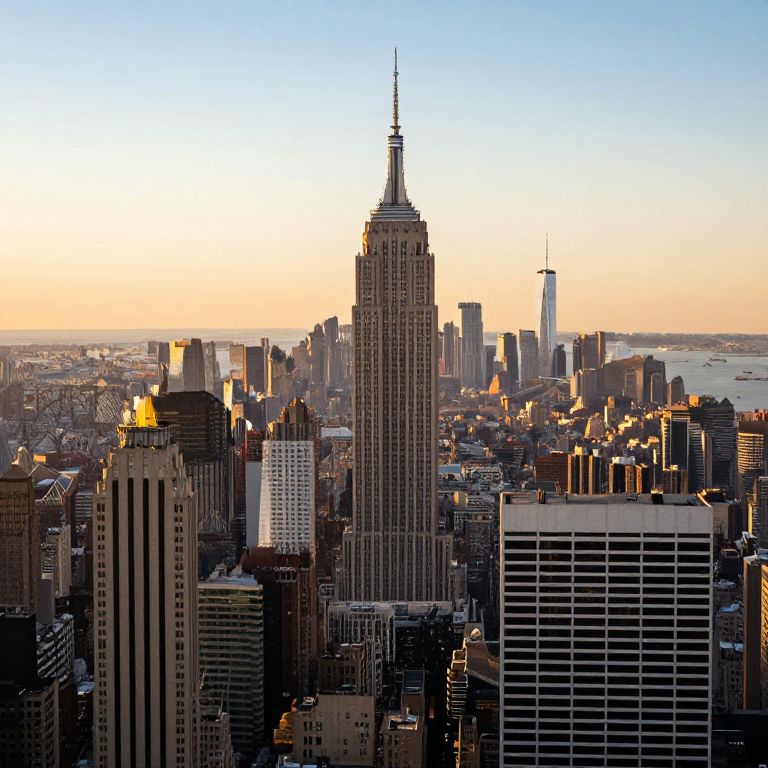 A stunning high-definition panoramic view captures the iconic Brooklyn and Manhattan skyline during the golden hour, showcasing the Empire State Building as a centerpiece amidst a vibrant array of skyscrapers bathed in warm, dramatic lighting, rendered with cinematic realism.