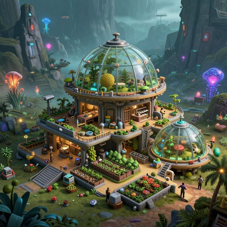 Awesome Rimworld base design featuring multi-level bio-domes, automated farming zones, intricate resource storage, surrounded by towering mountains and glowing alien flora, cinematic lighting.