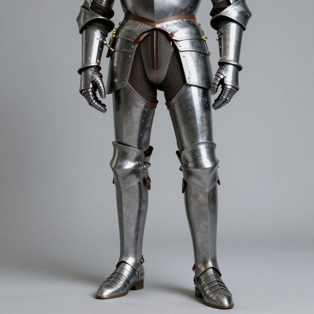 Photograph of a medieval-style, full-body silver metallic armor suit. The armor includes articulated gauntlets, shoulder guards, a chest plate, and a codpiece with a mesh center. The legs are protected by knee guards and shin guards, ending in pointed steel-toed boots. The armor has a polished, reflective surface with visible rivets and leather straps. The background is a plain, light gray, highlighting the shiny metallic texture and intricate design of the armor. The image focuses on the lower half of the torso to mid-thigh, omitting the face and upper body.