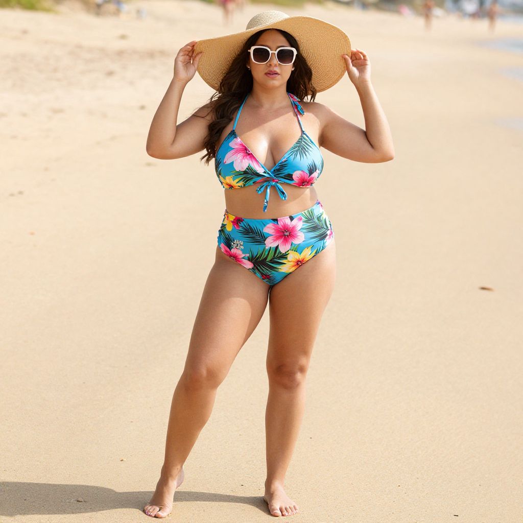 Photograph of a curvy woman with tan skin, wearing a colorful floral bikini, wide-brimmed straw hat, and white sunglasses, standing on