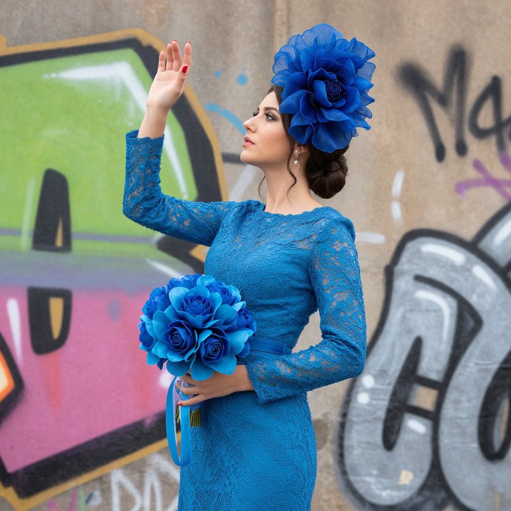 Woman modeling a Madison James long-sleeve lace gown, holding a vibrant blue bouquet while wearing an oversized blue floral headpiece, her hand gracefully raised against a colorful graffiti backdrop.
