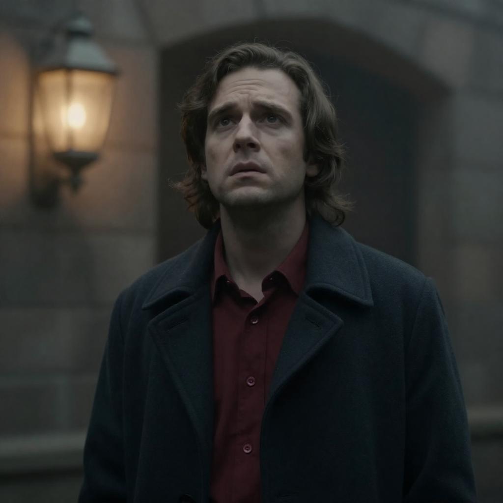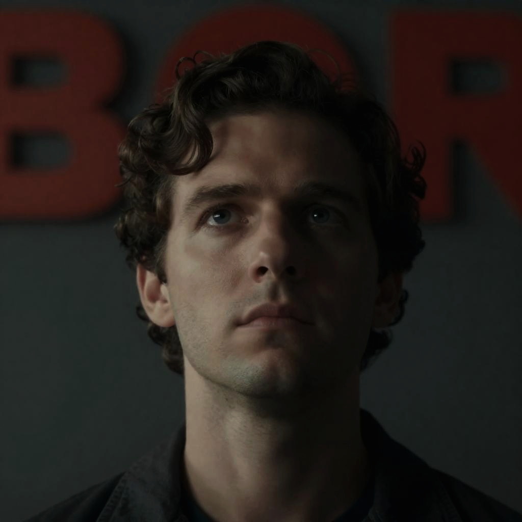 Close-up of a white man with curly brown hair, looking upward with a serious expression. Red letters in the blurred background. Low lighting, shadows on his face. Dark setting.