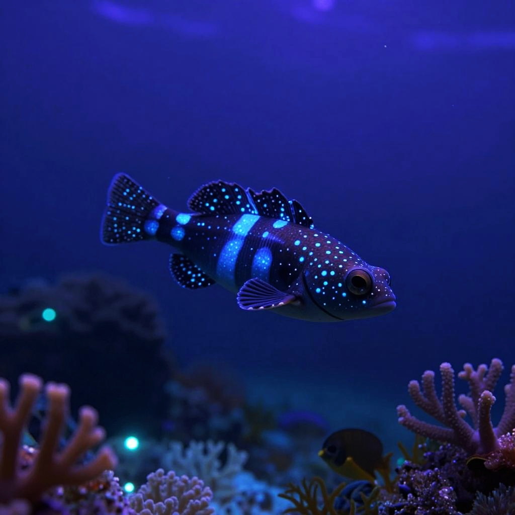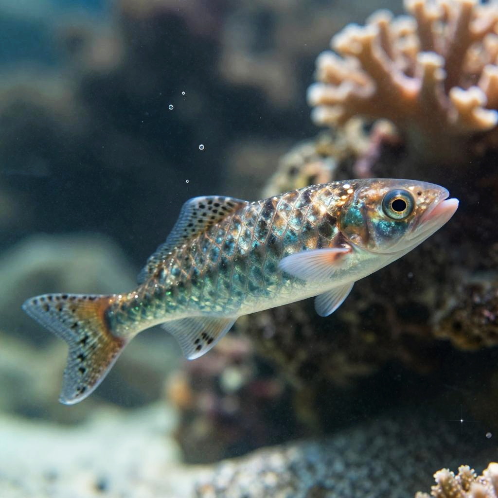 Close-up of a single pez with intricate patterns on its scales, swimming in crystal clear water, surrounded by tiny sparkling air bubbles and gentle light rays, with a soft blurred coral reef background, capturing natural beauty and delicate textures.