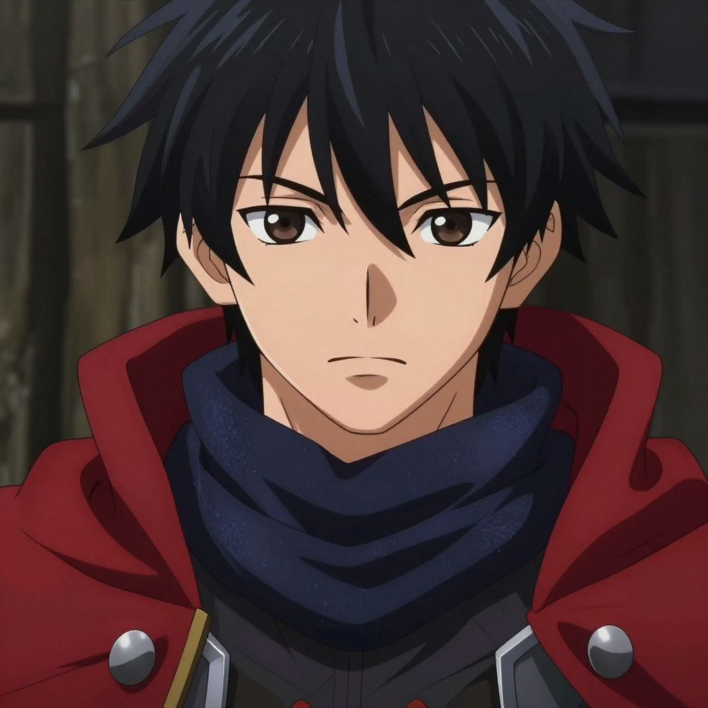Close-up portrait of an anime-style young male warrior with black hair and brown eyes, wearing a textured dark blue scarf and a red cloak. The character is depicted from the upper body, looking directly at the viewer with a serious expression and closed mouth. The outfit includes armor elements visible on the shoulders, emphasizing a fantasy warrior theme.