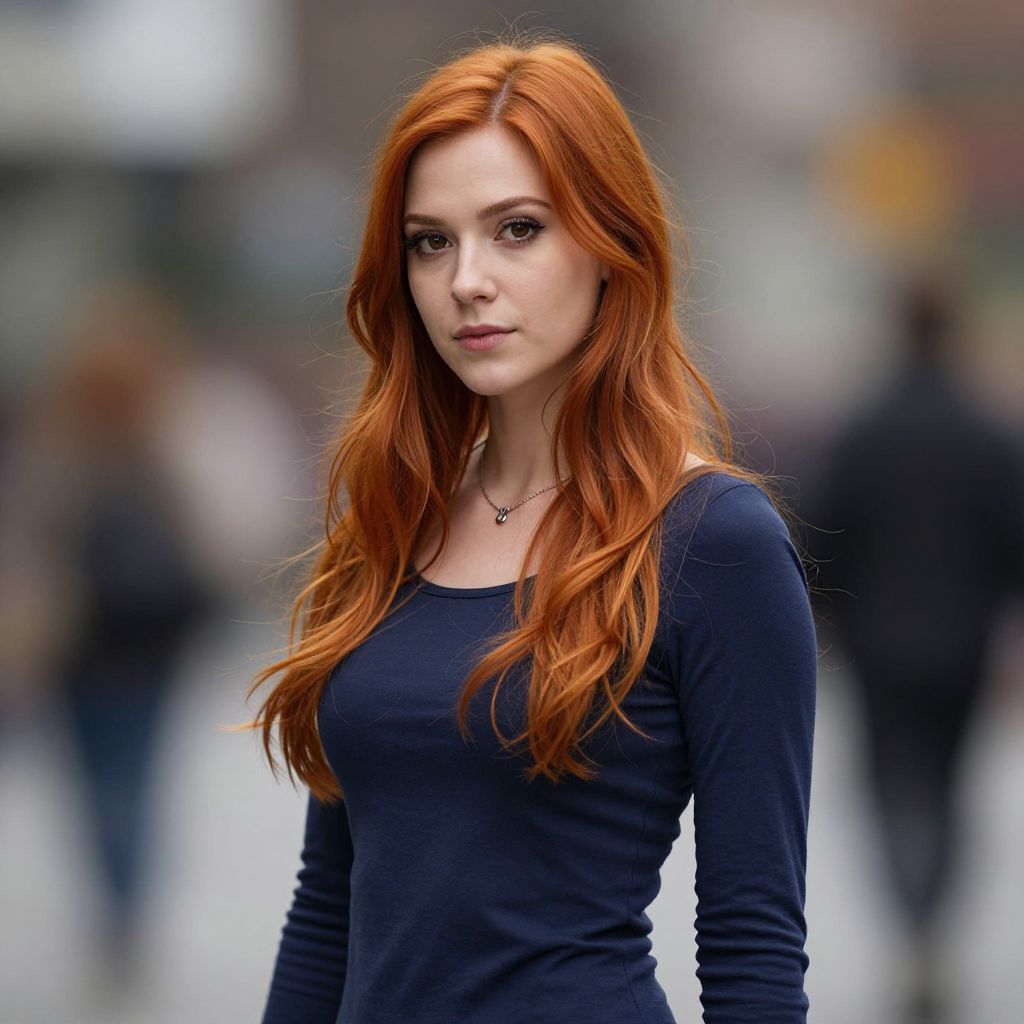 Photograph of a young woman with long, wavy, vibrant red hair and fair skin, wearing a form-fitting, long-sleeve, dark blue top. She has striking blue eyes and a subtle smile, with a small silver necklace around her neck. The background is blurred, featuring indistinct figures and colors, suggesting an urban setting. The focus is on her, with soft natural light highlighting her hair and facial features. The overall image has a slightly cinematic, realistic style.