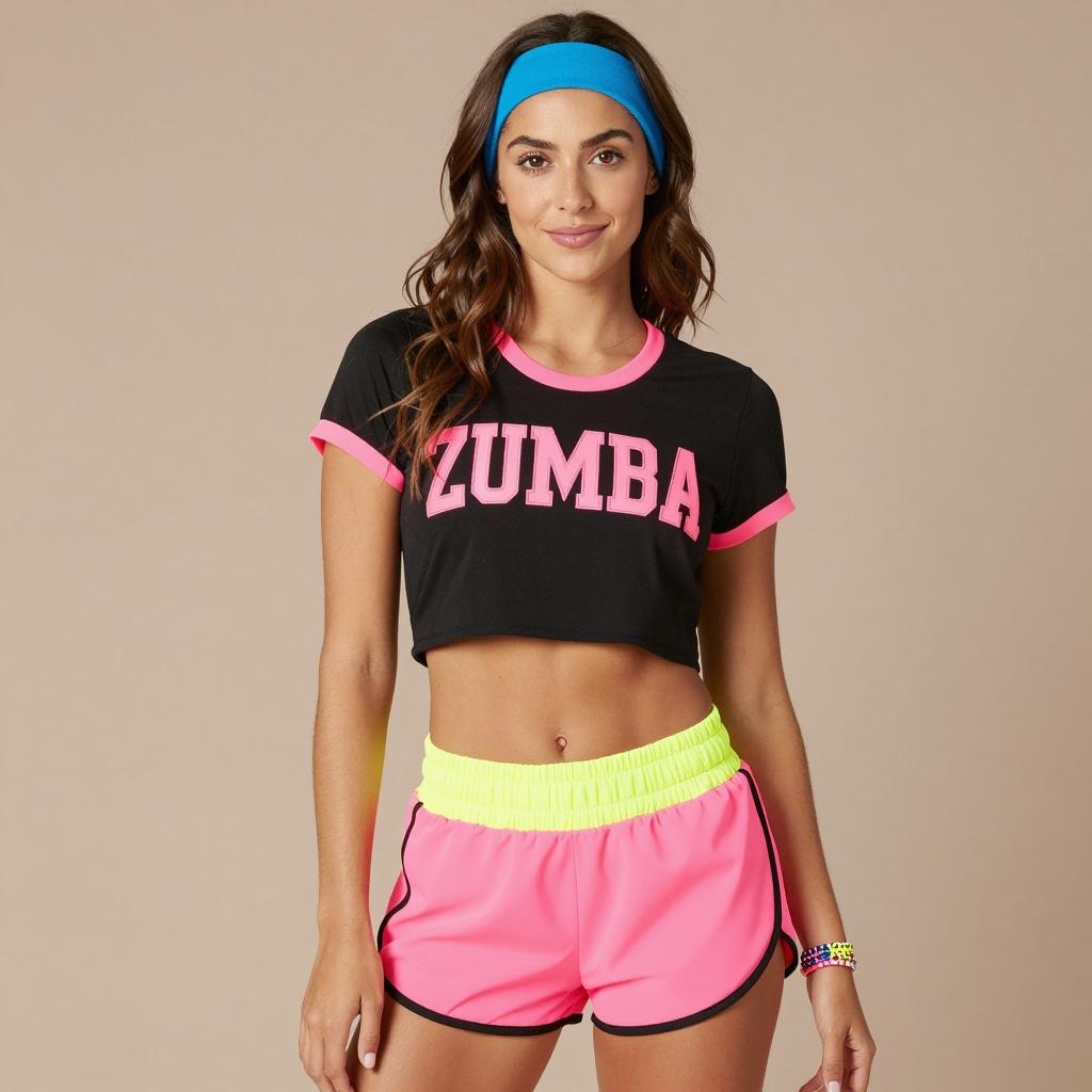 Photorealistic image of a young woman with brown hair and brown eyes wearing a blue headband, black cropped t-shirt with pink 'ZUMBA' lettering, and bright pink athletic shorts with a neon yellow waistband and black trim. She has a toned midriff and wears colorful bracelets on both wrists, standing confidently against a light brown studio background.