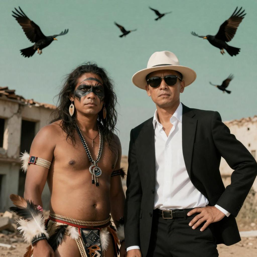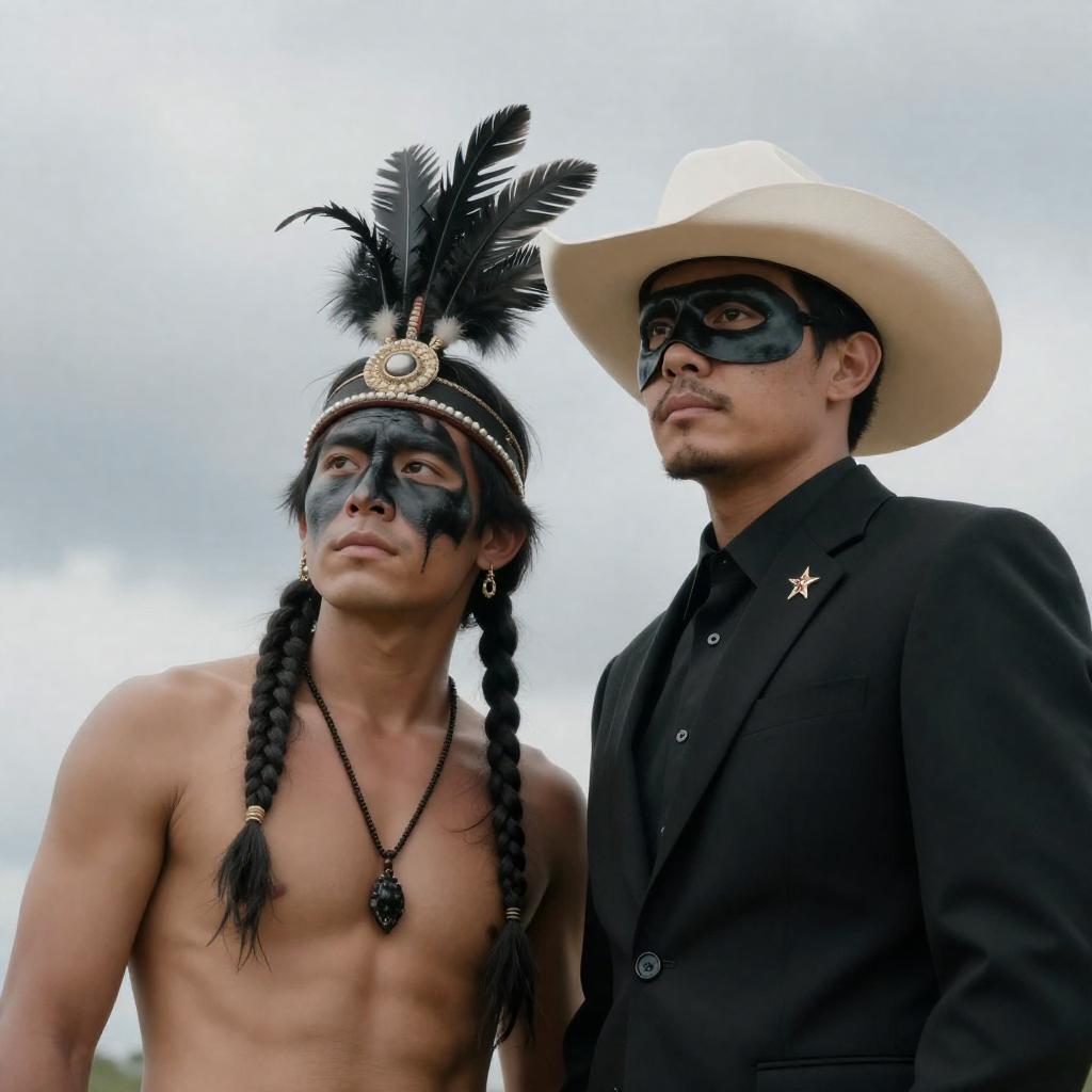 Photograph of two men against a cloudy sky. One man wears a black suit, white cowboy hat, black mask, and star pin. The other man has black face paint, feathered headgear with black feathers, long braids, and a dark necklace. The man in the suit stands to the right, the man with face paint to the left, both looking ahead.