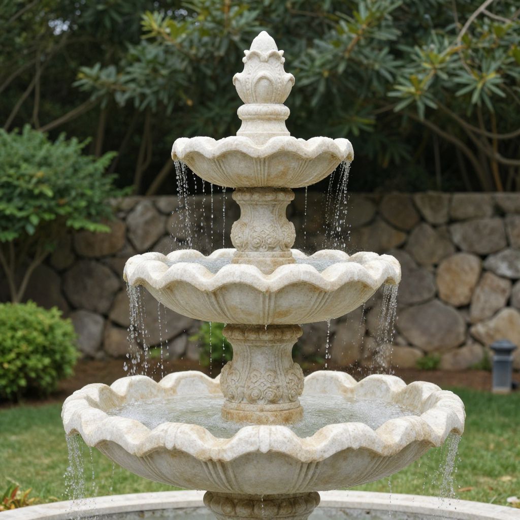 Elegant stone garden fountain featuring three cascading tiers, ornate carvings, and a scalloped basin, set against a backdrop of lush greenery and a stone wall.