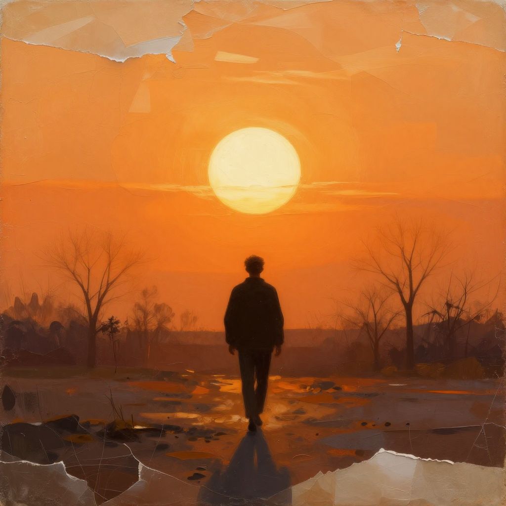 Silhouetted person walking toward a bright, orange sunset in a barren, tree-strewn landscape. Digital painting with textured, cracked edges.