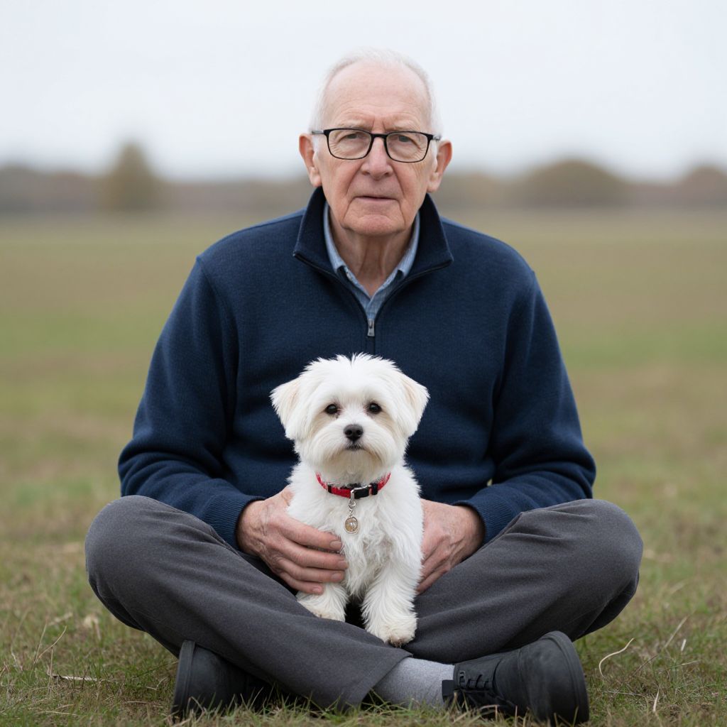 Photograph of an elderly white man with bald head and glasses, wearing a dark blue zip-up sweater and gray pants, sitting cross-legged on a grassy field. He holds a small white fluffy dog with a red collar and a gold tag, which sits upright between his hands. The background is an out-of-focus, expansive green field with a blurred, light gray sky. The man's expression is neutral, and the dog looks directly at the camera. The image has a soft, natural light, emphasizing the serene outdoor setting.
