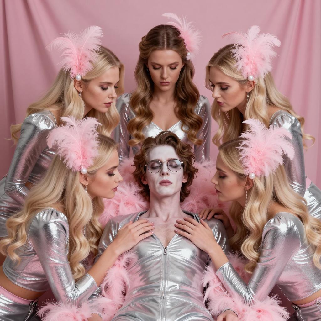 Man with glasses, pale skin, and brown hair lies in center, surrounded by five blonde women with pink feathered hair accessories. All wear shiny silver and pink outfits, pink feather boas. Women lean close, focused on man's chest. Pink draped background. Five women, one man. Intense expressions on women's faces. Pink and silver color scheme.